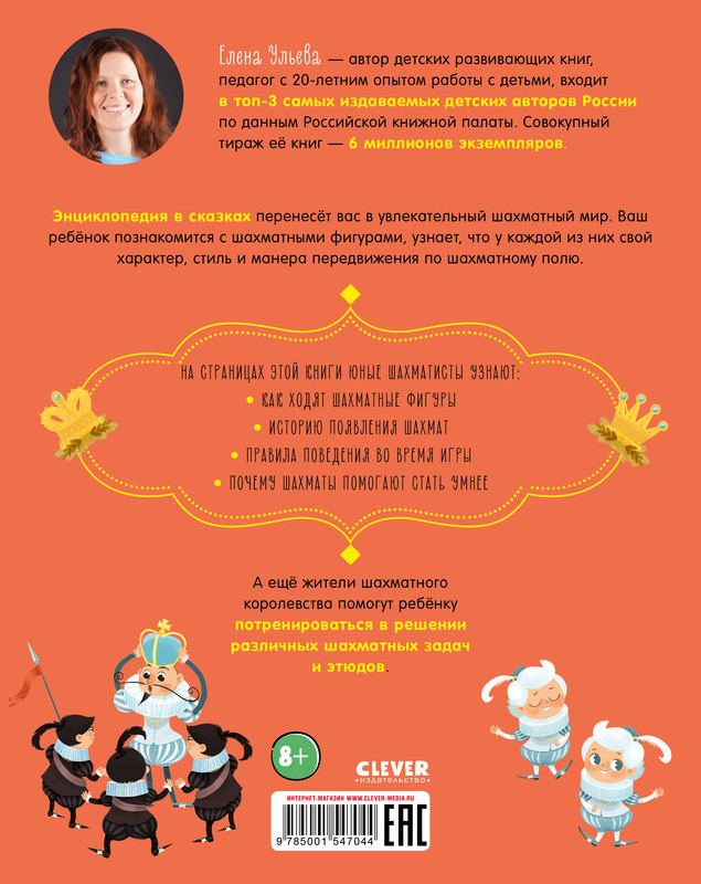 Серия: Удивительные энциклопедии Энциклопедия в сказках познакомит детей с шахматными фигурами. Это отличный подарок выпускнику детского сада, школьнику или на день рождения. На страницах книги 70 важных шахматных тем за весь курс обучения 1-4 классы и 40 сказок про шахматы. Ребенок узнает, как ходят шахматные фигуры; историю появления шахмат; все правила и требования к игрокам; что нужно делать, чтобы победить в игре; за что присуждают шахматные разряды; что нужно сделать, чтобы стать гроссмейстером; почему шахматы помогают стать умнее и многое другое. Ваш малыш потренируется в решении шахматных задач и этюдов. Мы раскроем вам большинство шахматных секретов! Книгу создала Елена Ульева, талантливый автор детских книг, мастер сказок, педагог с 20-летним опытом работы с детьми. |