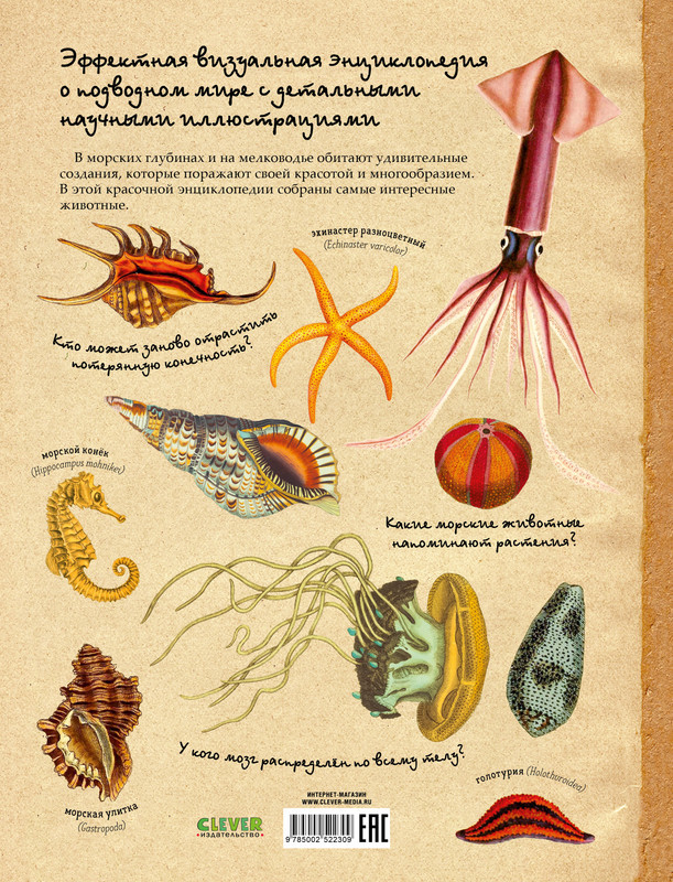 Эффектная визуальная энциклопедия о подводном мире с детальными научными иллюстрациями В морских глубинах и на мелководье обитают удивительные создания, которые поражают своей красотой и многообразием. В этой красочной энциклопедии собраны самые интересные животные.
