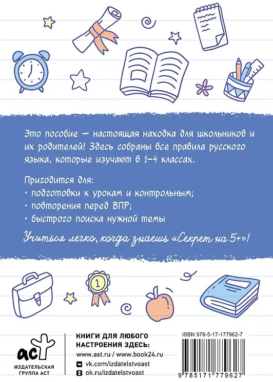 Серия: Секрет на 5+ В этом пособии собраны все основные правила русского языка, которые проходят в 1-4 классах, от орфографии до пунктуации. Материал изложен кратко, чётко и системно — так, чтобы ребёнку было легко запомнить, а взрослому — просто объяснить. Пособие подходит для регулярной подготовки к урокам, самостоятельной работы дома, повторения перед проверочными и контрольными работами. Предназначено для учащихся в начальной школе. |