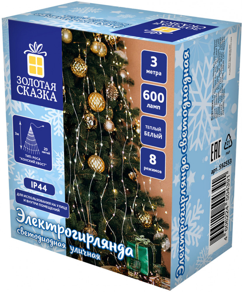 Гирлянда «Конский хвост» ЗОЛОТАЯ СКАЗКА — это великолепное украшение для вашей новогодней ели, которое добавит уникальный шарм и волшебство в праздничную атмосферу! Гирлянда «Конский хвост» представляет собой 20 светодиодных нитей, которые между собой связаны в пучок и закреплены в пластиковый держатель. Длина гирлянды 3 метра позволяет одной гирляндой украсить всю ёлку быстро и стильно. Светодиодные лампы (600 шт.), сделаны на основе технологии LED, которая является более безопасной и эффективной по сравнению с лампой накаливания. Длина рабочей части гирлянды составляет 3 м. Количество светодиодов — 600 шт. Расстояние между светодиодами — 10 см.