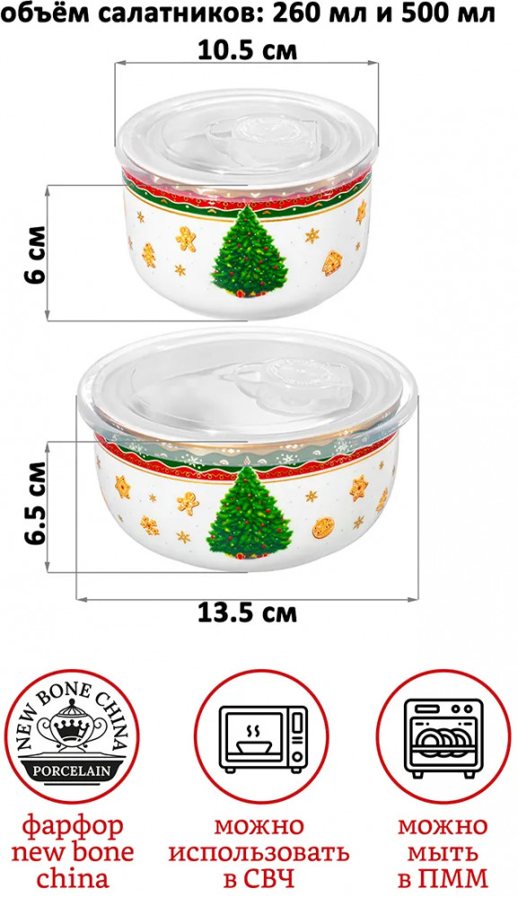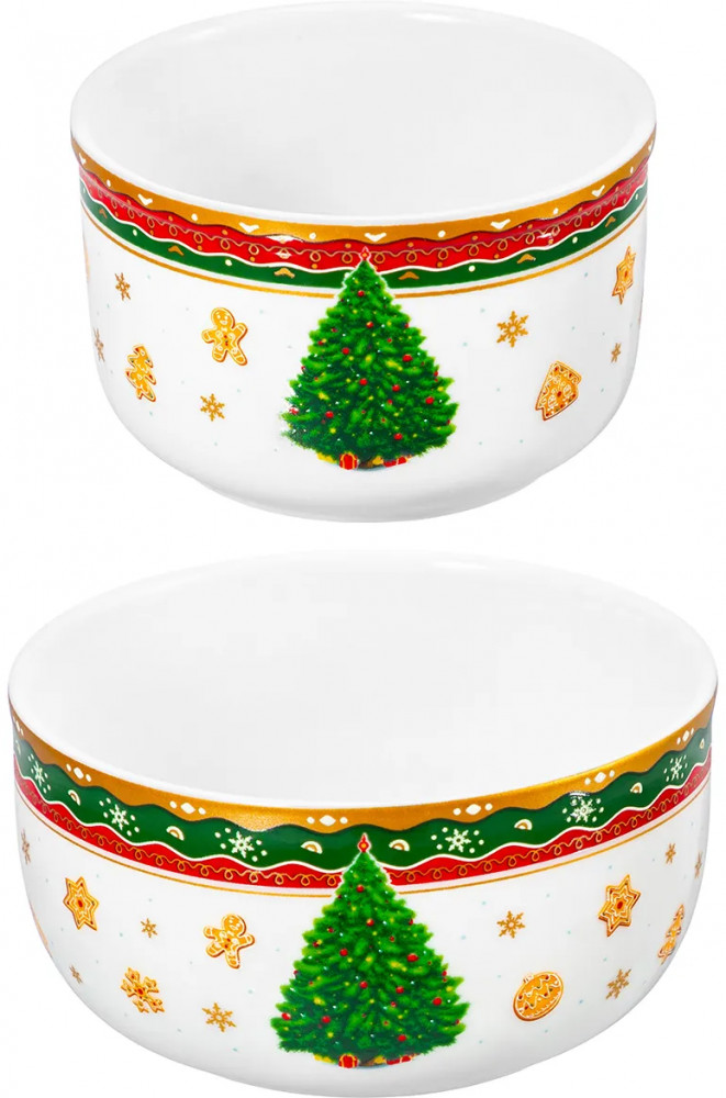 Набор 2 салатников из серии «Новогодняя ёлка» от Elan Gallery предназначен для эстетичной сервировки вашего стола. Выполнены из фарфора нового поколения new bone china, сочетающего в себе изящность и высокую прочность. Такие изделия легко отмываются, поэтому сохраняют привлекательный вид и практичны в использовании. Плотная структура материала позволяет посуде дольше сохранять температуру блюд и напитков. От других видов костяного фарфора new bone china отличается большей экологичностью в производстве. Поверхность украшена широкой цветной окантовкой, изображением пушистой наряженной ёлочки, узором из снежинок и имбирных пряников.