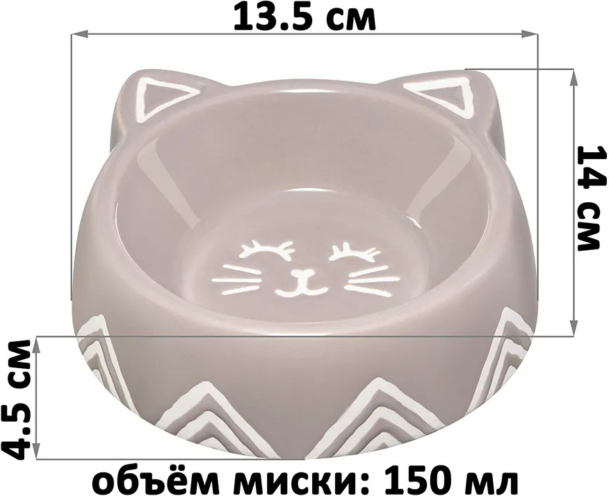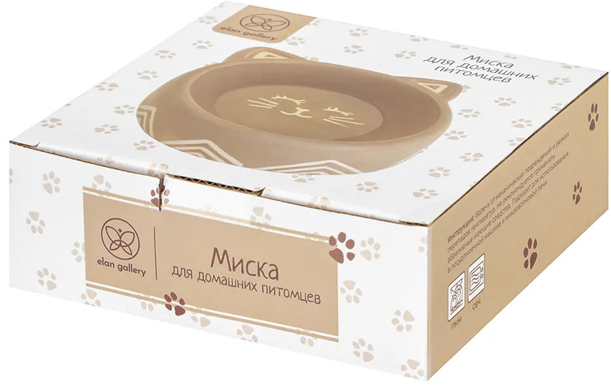 Миска для домашних животных от Elan Gallery. Размер ёмкости — 14×13,5×4,5 см, объём — 150 мл. Размер внутреннего дна — 7,5×7,5×3 см. Выполнена из керамики, безопасной для здоровья и не выделяющей вредных веществ. В отличие от металлической посуды, керамические изделия не впитывают запах, что особенно важно для животных из-за хорошего обоняния. Они гипоаллергенны и легко отмываются, что делает их удобными в повседневном использовании. Фигурная мисочка выполнена в виде кошачьей мордочки с ушками и рисунком на дне.