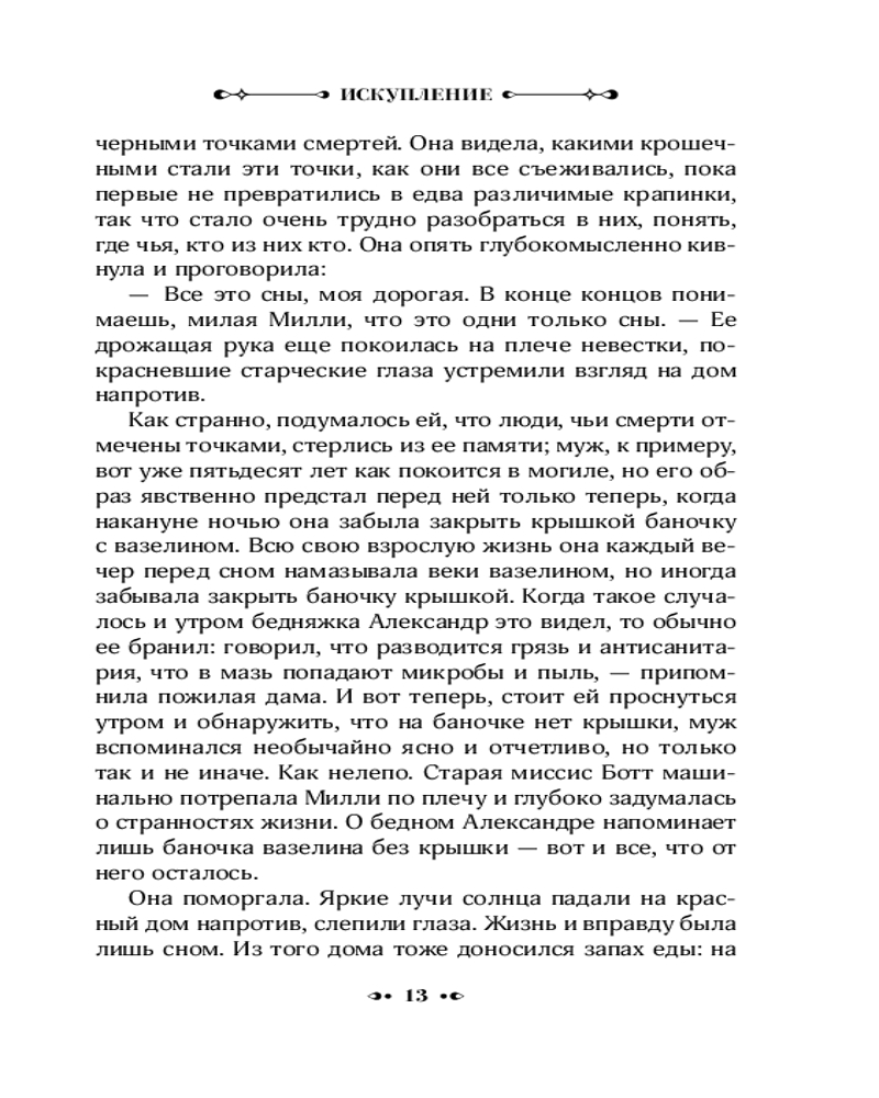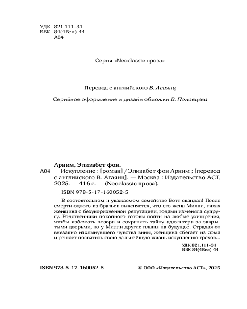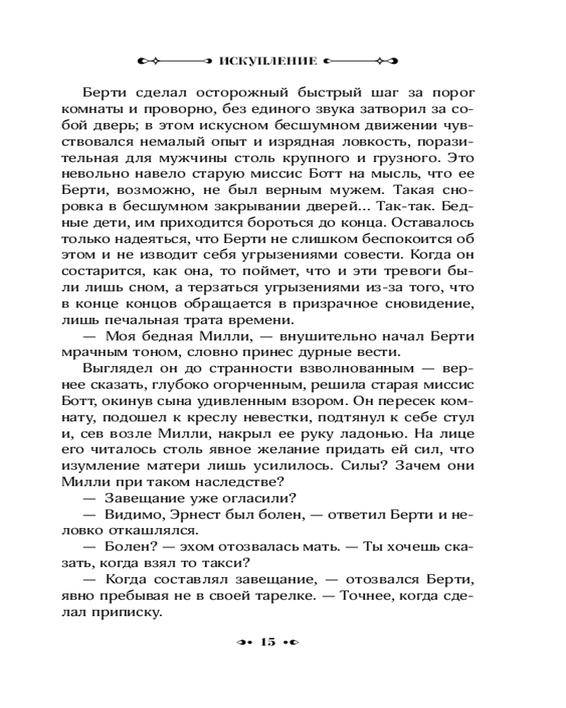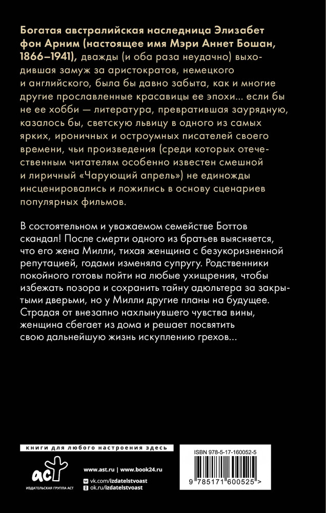 Серия: Neoclassic проза В состоятельном и уважаемом семействе Боттов скандал! После смерти одного из братьев выясняется, что его жена Милли, тихая женщина с безукоризненной репутацией, годами изменяла супругу. Родственники покойного готовы пойти на любые ухищрения, чтобы избежать позора и сохранить тайну адюльтера за закрытыми дверьми, но у Милли другие планы на будущее. Страдая от внезапно нахлынувшего чувства вины, женщина сбегает из дома и решает посвятить свою дальнейшую жизнь искуплению грехов... |