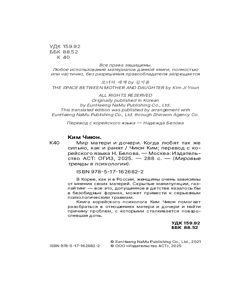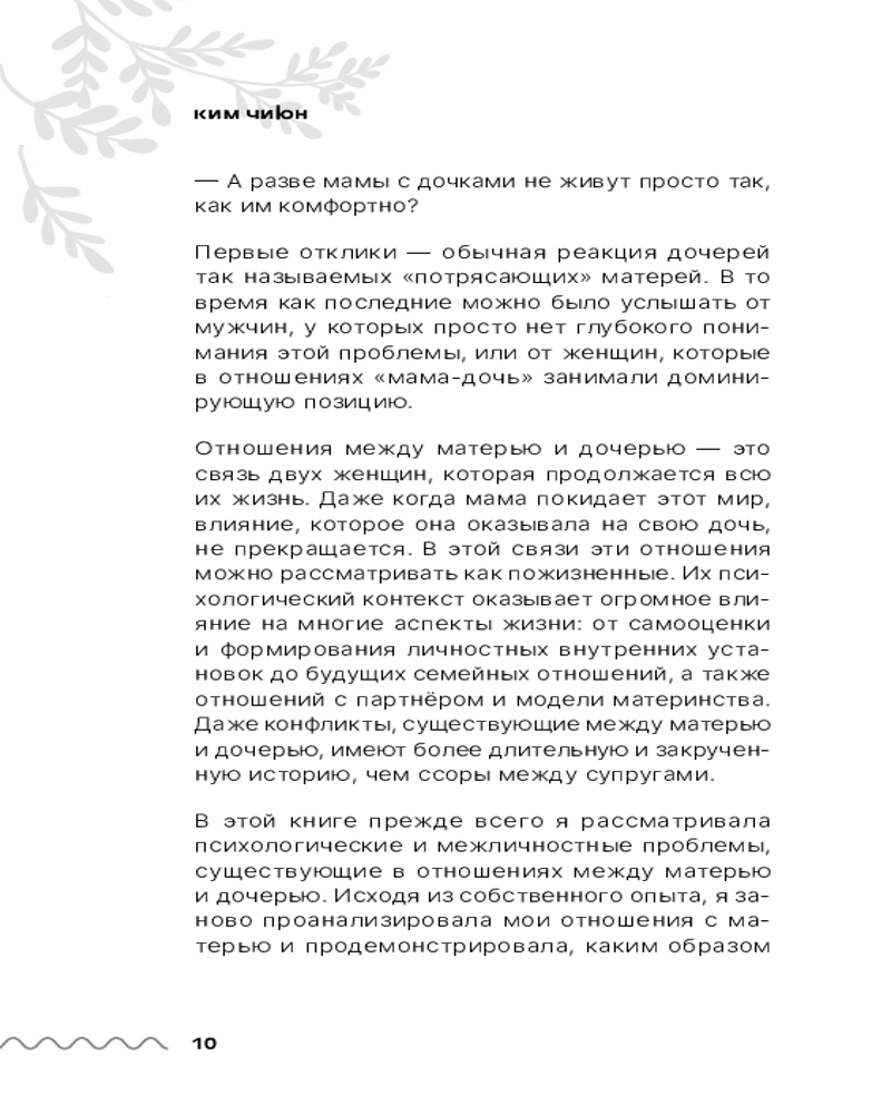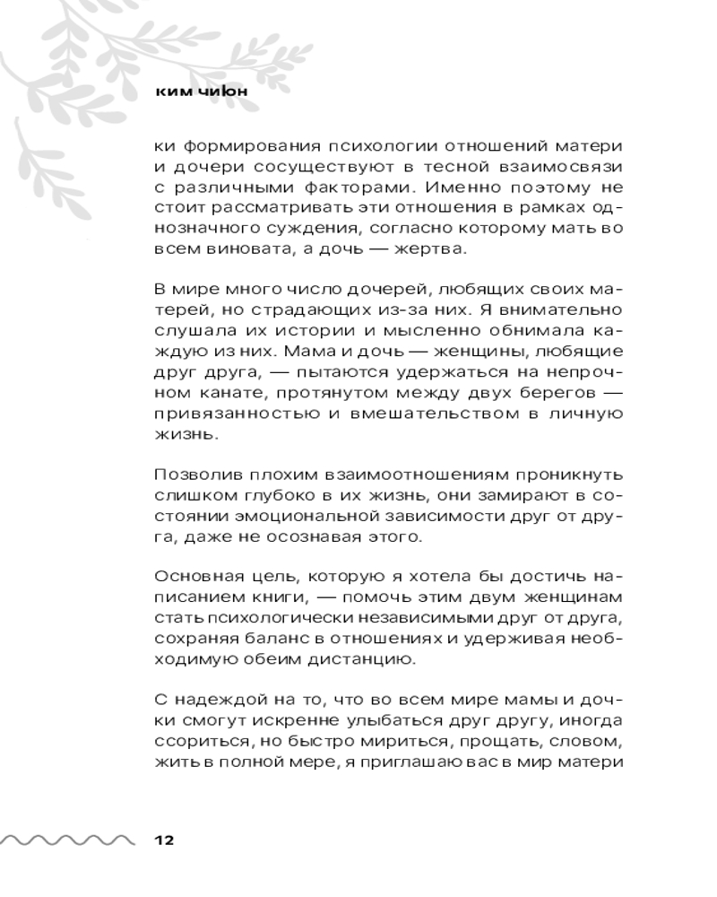 Серия: Мировые тренды в психологии В Корее, как и в России, женщины очень зависимы от мнения своих матерей. Скрытые манипуляции, газлайтинг — все это, допущенное в детстве казалось бы в безобидных формах, может привести к серьезным психологическим травмам. Книга корейского психолога Ким Чиюн помогает разобраться в отношениях матери и дочери и найти причину проблем, с которыми сталкивается повзрослевшая дочь. |