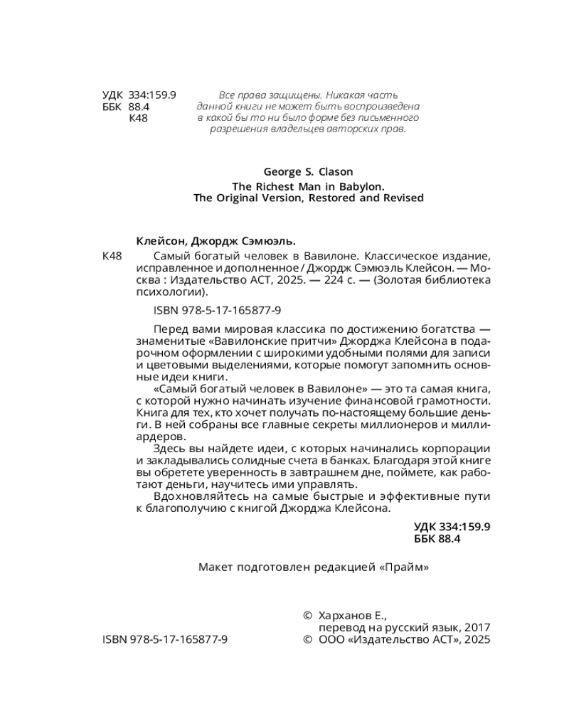 Серия: Золотая библиотека психологии Перед вами мировая классика по достижению богатства — знаменитые «Вавилонские притчи» Джорджа Клейсона в подарочном оформлении с широкими удобными полями для записи и цветовыми выделениями, которые помогут запомнить основные идеи книги. |