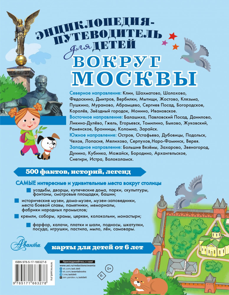 Серия: Энциклопедия-путеводитель для детей Приглашаем взрослых и детей в путешествие вокруг столицы нашей родины — города Москвы. Усадьбы, храмы, музеи, памятники, парки, фабрики народных промыслов, места, где можно попробовать вкусности или изготовить елочную игрушку — самые разнообразные достопримечательности городов, поселков и деревень, расположенных на севере, юге, востоке и западе от Москвы, собраны в этой книге. Полезная информация, рассказы и легенды об исторических местах и личностях, задания для детей и, конечно, замечательные фотографии и уникальные детские карты, которые помогут лучше узнать интересные места вокруг Москвы. Узнавай свою страну, путешествуя с энциклопедией-путеводителем! |