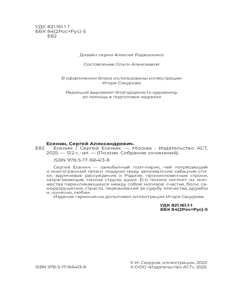 Это не просто собрание стихов — это живая летопись души поэта: в ней дыхание русской природы, светлая грусть уходящей деревни, порыв к любви и к вечности. В каждой строке — искренность, боль и красота, сделавшие Есенина голосом русской души. |