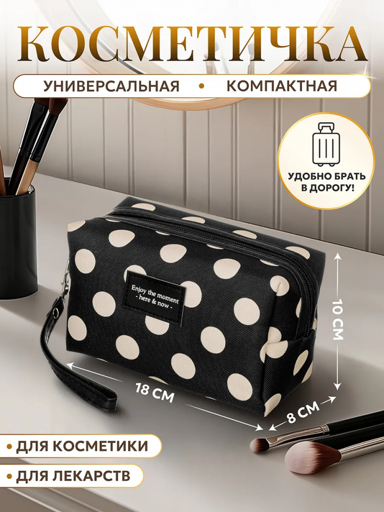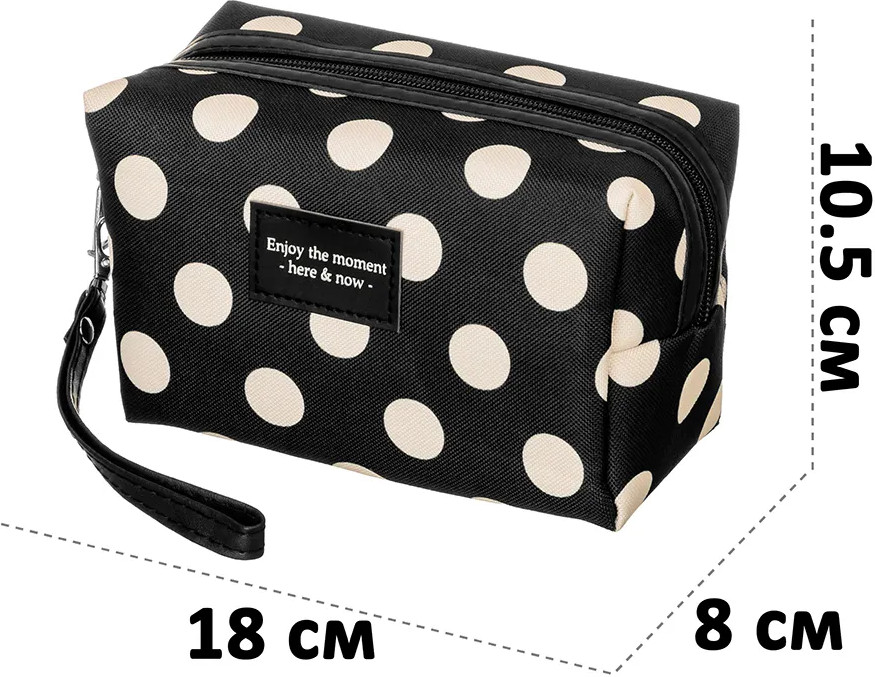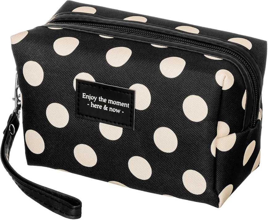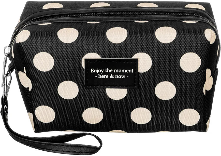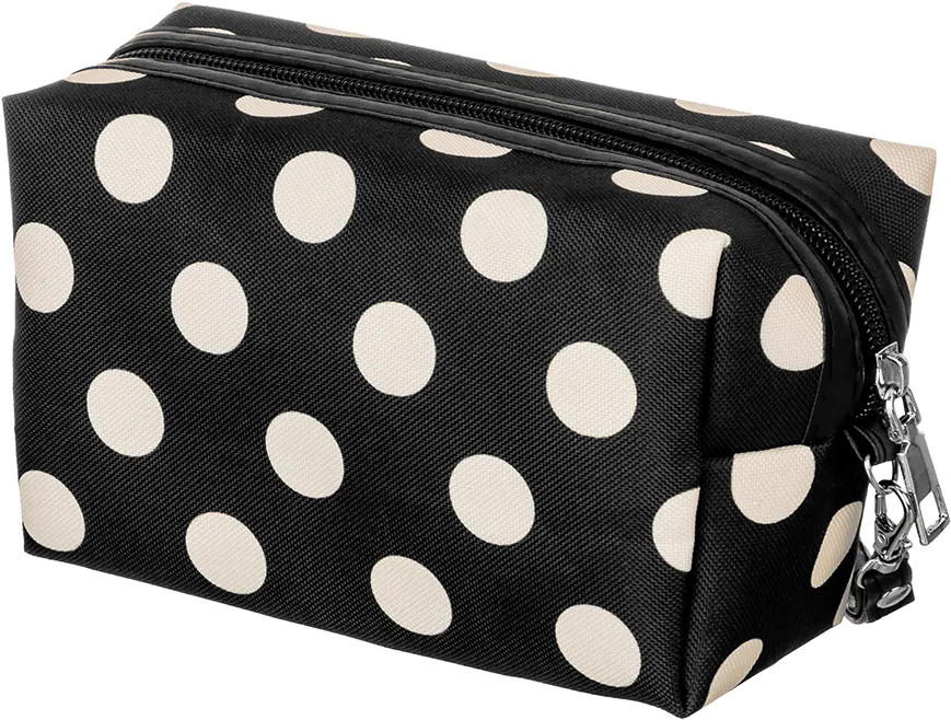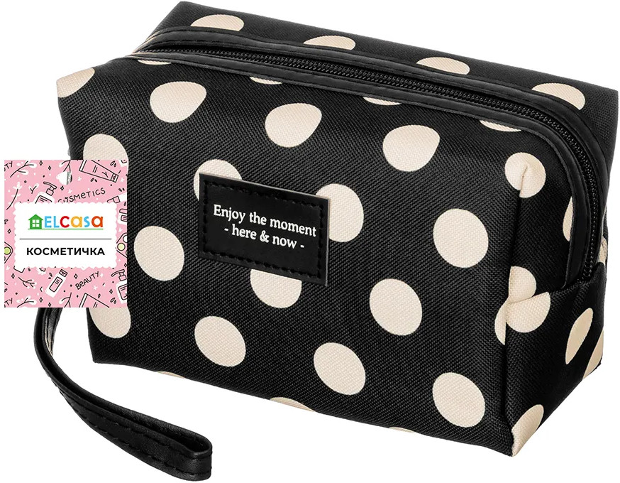 Благодаря стильному чёрному дизайну в белый горошек косметичку можно хранить даже на видном месте, например, на полке или вешалке. Она гармонично дополнит любой интерьер! Прочная чёрная ручка обеспечит удобство при переноске, поэтому изделие выступит в роли практичной походной сумки. Возьмите её с собой в путешествие или поездку для перевозки разнообразных мелочей. Она послужит в роли дорожной аптечки для удобной транспортировки лекарств. Это не только оригинальный, но и функциональный подарок как для девочки, так и для женщины. Не рекомендуется применять абразивные моющие средства. В коллекции бренда El Casa вы найдет большой ассортимент товаров для дома, которые помогут вам организовать бережную систему хранения ваших вещей!