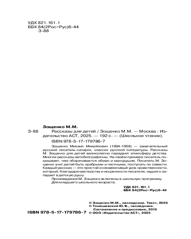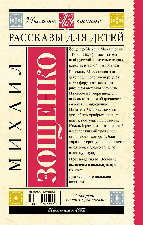 Серия: Школьное чтение Зощенко Михаил Михайлович (1894-1958) — замечательный русский писатель-сатирик, классик русской литературы. Рассказы М. Зощенко для детей великолепно передают атмосферу детства. Многие рассказы автобиографичны. На своём примере писатель показывает, чем оборачивается обман и малодушие. Писатель М. Зощенко учит детей быть храбрыми и честными, поступать по совести. Каждый рассказ — это простой и ненавязчивый урок нравственности, который, благодаря мастерству и искренности писателя, надолго западает в детскую душу.  |