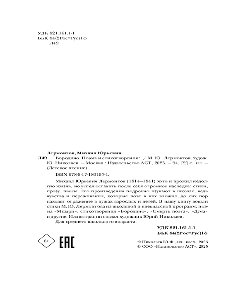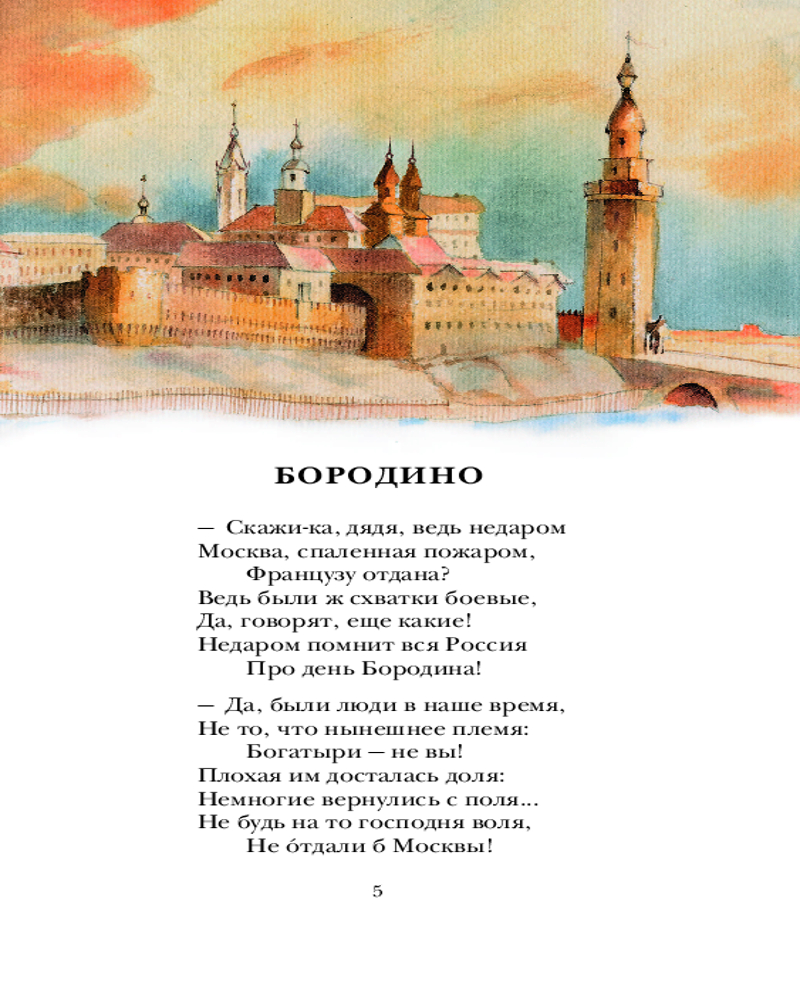 Серия: Детское чтение Михаил Юрьевич Лермонтов (1814-1841) хоть и прожил недолгую жизнь, но успел оставить после себя огромное наследие: стихи, прозу, пьесы. Его произведения подробно изучают в школах, ведь чувства и переживания, которые поэт в них вложил, до сих пор находят отражение в душах взрослых и детей. В нашу книгу вошли стихи М. Ю. Лермонтова из школьной и внеклассной программ: поэма «Мцыри», стихотворения «Бородино», «Смерть поэта», «Дума» и другие. Иллюстрации создал художник Юрий Николаев. |