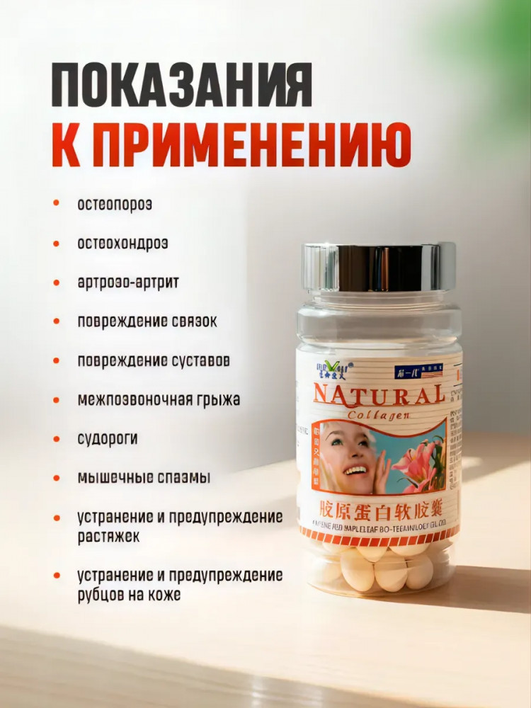 Коллаген в организме человека в большом количестве содержится в хрящах, сухожилиях, костях, связках, коже и является структурной основой всех без исключения органов и тканей. Организм не производит коллагена «про запас» расходуя его, тем не менее в процессе всей жизни. От достатка коллагена зависит наша жизнедеятельность, внешний вид, наша молодость и здоровье. Китайский препарат «Коллаген» представляет собой уникальный природный сбалансированный источник аминокислот, в том числе и всех незаменимых: аргинина, валина, гистидина, изолейцина, лейцина, лизина, метионина, треонина, триптофана, фенилаланина и хорошо усваиваемый организмом кальций.