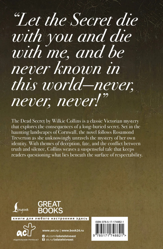 Серия: Great Books Смертельная тайна, унесённая в могилу, продолжает влиять на жизни живых. Розамонд Франкленд сталкивается с загадочным прошлым, которое упорно не хочет оставаться забытым. Героиня должна разобраться в запутанном клубке семейных тайн, подмен и скрытых писем и раскрыть правду — даже если она грозит разрушить всё, что ей дорого. «Мертвая комната» — захватывающий готический роман, в котором Уилки Коллинз мастерски сочетает интригу, драму и психологическую глубину. Роман публикуется на английском языке без адаптации и сокращений. |