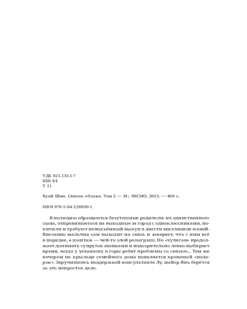 Серия: Комильфо. Китайские романы и маньхуа В полицию обращаются безутешные родители: их единственного сына, отправившегося на выходные за город с одноклассниками, похитили и требуют неподъёмный выкуп в двести миллионов юаней. Внезапно мальчик сам выходит на связь и заверяет, что с ним всё в порядке, а шантаж — чей-то злой розыгрыш. Но «хулиган» продолжает донимать супругов звонками и подозрительно ловко выбирает время, когда у уехавших в горы ребят проблемы со связью... Тем же вечером на крыльце семейного дома появляется кровавый «подарок». Заручившись поддержкой консультанта Лу, майор Янь берётся за это непростое дело. |