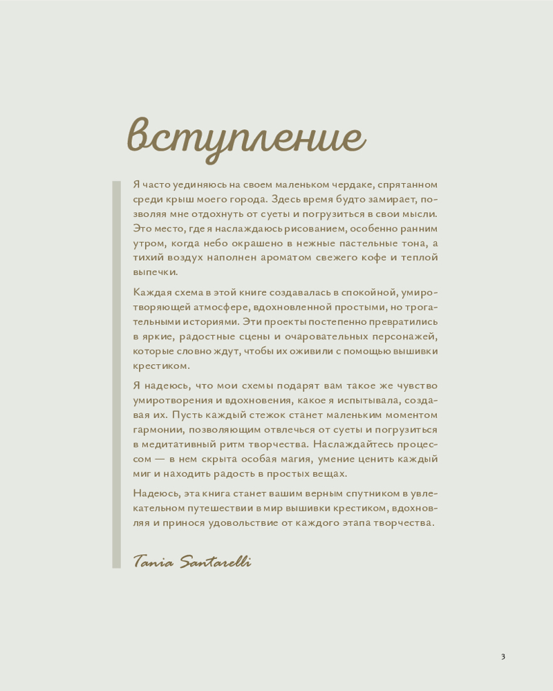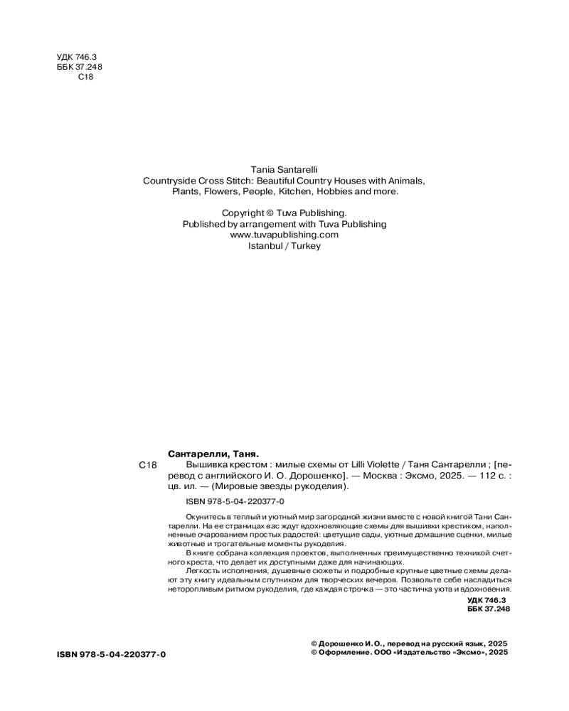 Серия: Мировые звезды рукоделия Окунитесь в мир уюта и вдохновения с новой книгой Тани Сантарелли! Представьте, как приятно провести вечер за любимой вышивкой, когда за окном тихий дождь, в руках — чашка ароматного чая, а перед вами — потрясающие схемы, наполненные теплом и добротой. Уникальные авторские схемы: милые зверушки, цветущие сады, уютные домашние сценки и романтичные пейзажи, которые хочется вышивать снова и снова! Идеально для любого уровня: большинство дизайнов выполнены только крестиком, а дополнительные швы сведены к минимуму. Начинающие легко освоят, а опытные мастерицы получат удовольствие от процесса! Творчество как медитация: каждая схема создавалась в атмосфере спокойствия и вдохновения. Наслаждайтесь плавным ритмом вышивания, отдыхайте от забот и открывайте для себя особое удовольствие рукоделия. Красота в деталях: эти вышивки украсят ваш дом, станут душевным подарком или любимой реликвией, передающей тепло ваших рук. |