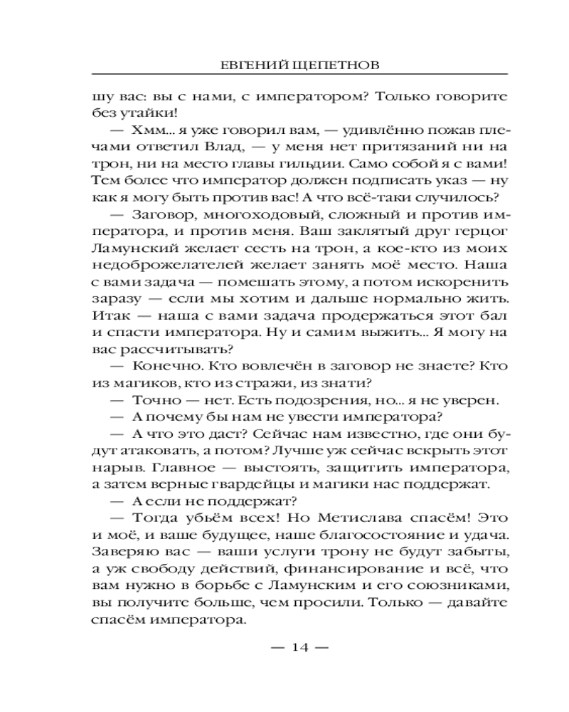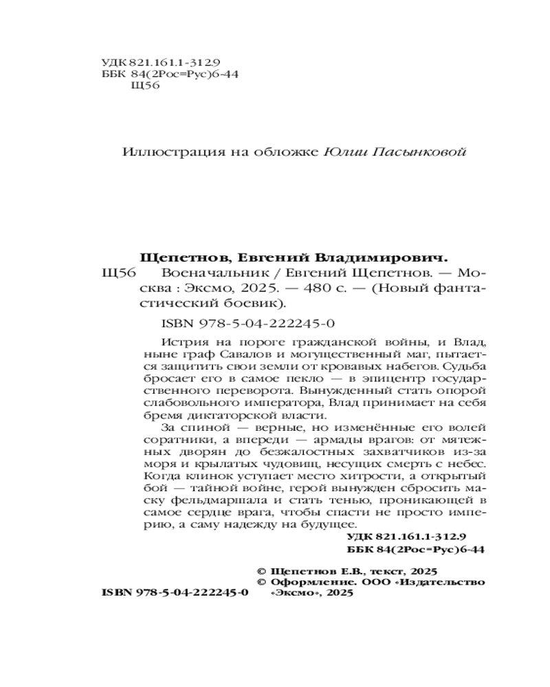 Серия: Новый фантастический боевик. Миры Евгения Щепетнова Истрия на пороге гражданской войны, и Влад, ныне граф Савалов и могущественный маг, пытается защитить свои земли от кровавых набегов. Cудьба бросает его в самое пекло — в эпицентр государственного переворота. Вынужденный стать опорой слабовольного императора, Влад принимает на себя бремя диктаторской власти. За спиной — верные, но изменённые его волей соратники, а впереди — армады врагов: от мятежных дворян до безжалостных захватчиков из-за моря и крылатых чудовищ, несущих смерть с небес. Когда клинок уступает место хитрости, а открытый бой — тайной войне, герой вынужден сбросить маску фельдмаршала и стать тенью, проникающей в самое сердце врага, чтобы спасти не просто империю, а саму надежду на будущее. |