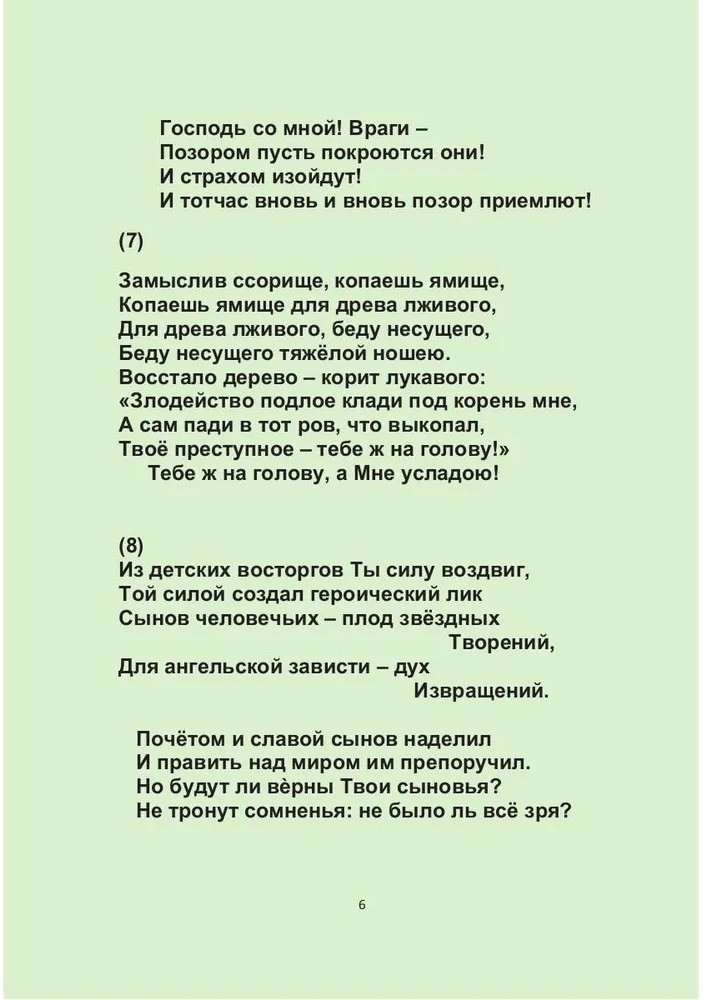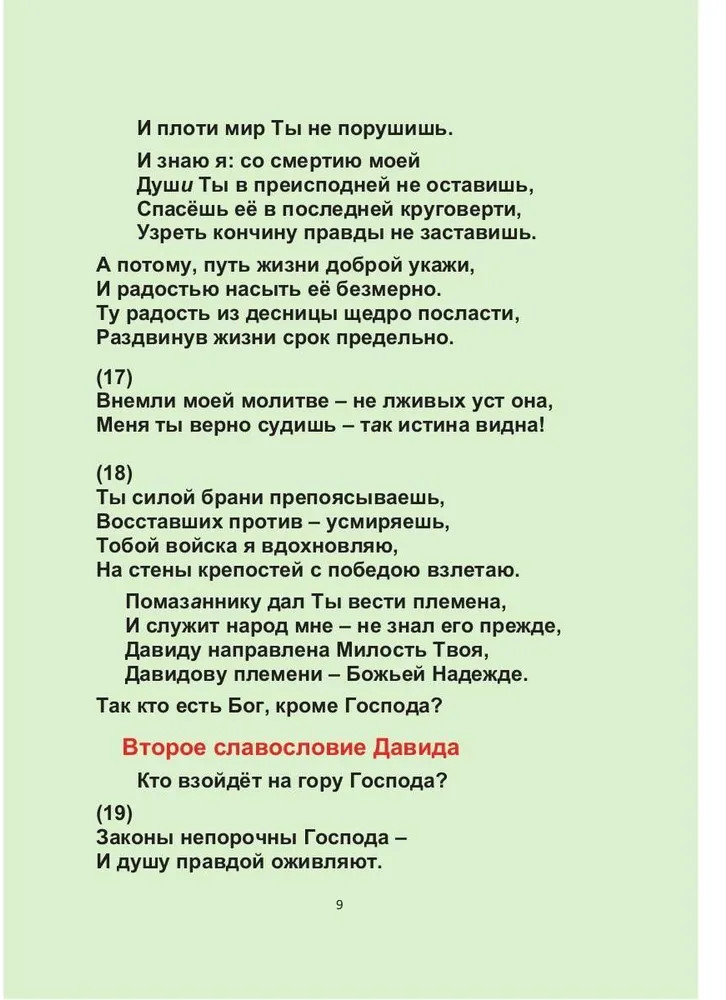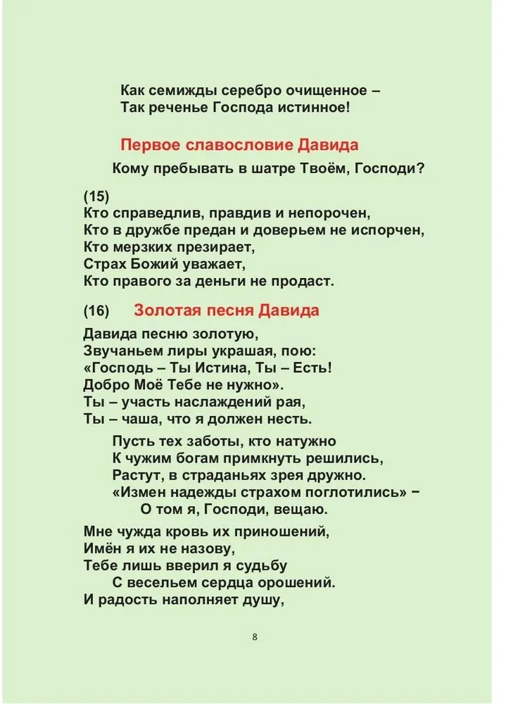 Оригинальная стихотворная интерпретация, не без критических нюансов, нравственно возвышенных «Псалмов Давида», овеянных веками популярности. Мостом в современность видятся наставления «Десятословия» Моисея. Заключительным аккордом Познания звучат слова Екклесиаста: «Всё суета и тяжкое томленье духа». История Вирсавии и Давида призвана придать некоторым стихам лирический оттенок. |