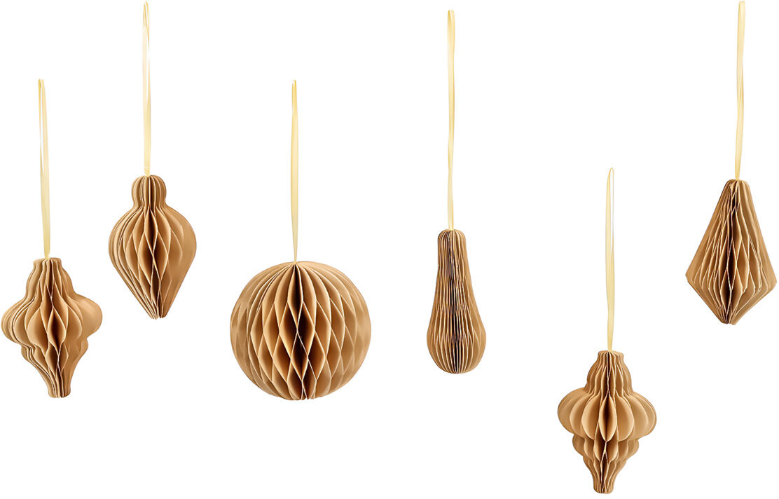 Набор декоративных украшений Золотая Сказка для новогодней ели из бумаги разной формы наполнит Ваш дом волшебной атмосферой праздника. В наборе украшения размером 9×6.5 см, 9×7.5 см (2 шт.), 9.5×6 см, 10×4 см, 10×10 см. Цвет украшений — крафт. В верхней части декоративные украшения имеют петлю для подвешивания изделия.