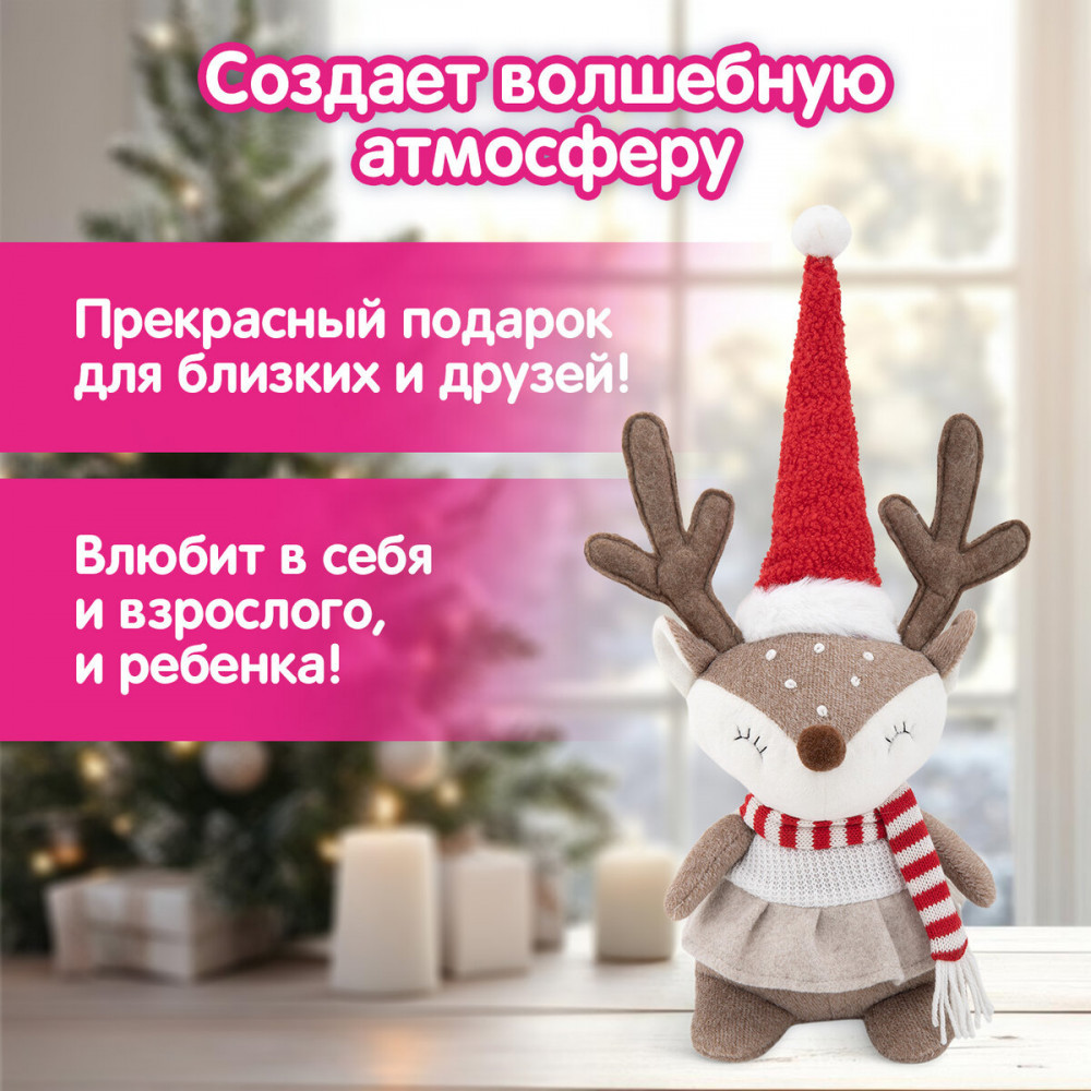 Вдохните жизнь в Ваш дом с интерьерной куклой «Веселый оленёнок»! Эта очаровашка станет незаменимым элементом Вашего новогоднего декора. Она одета в симпатичный колпачок и шарфик, а ее юбочка добавляет особого шарма. Малышка станет настоящим центром внимания в Вашем интерьере и поднимет настроение всем членам семьи.