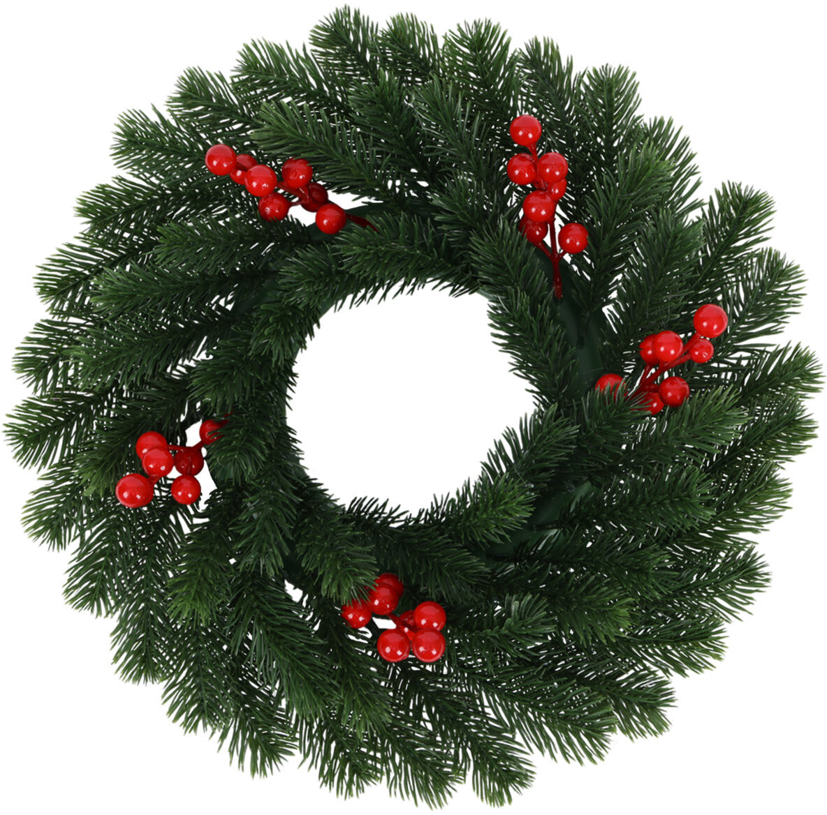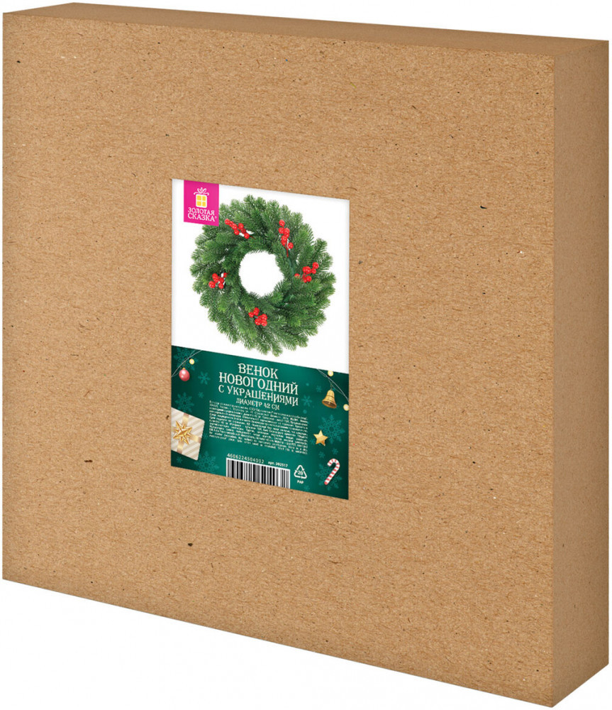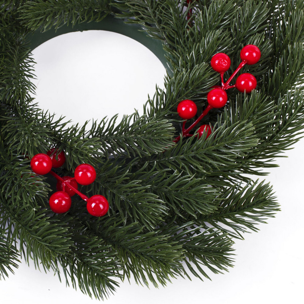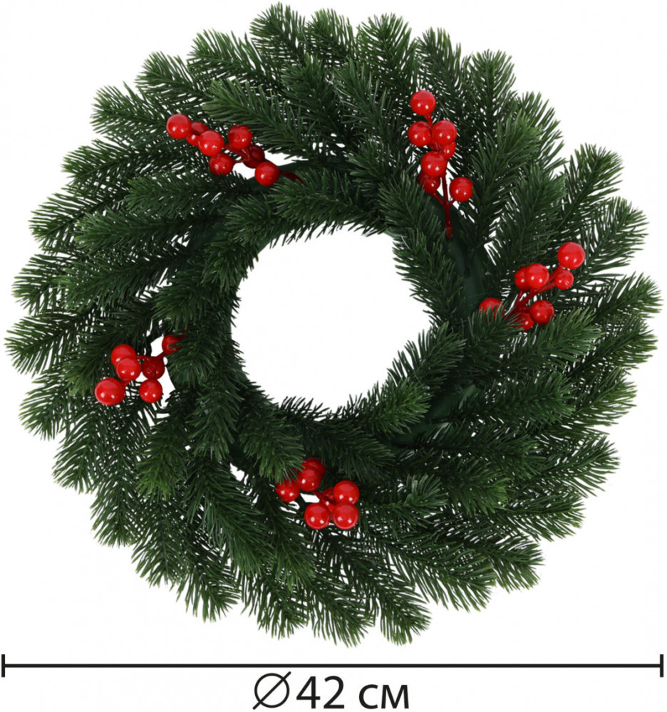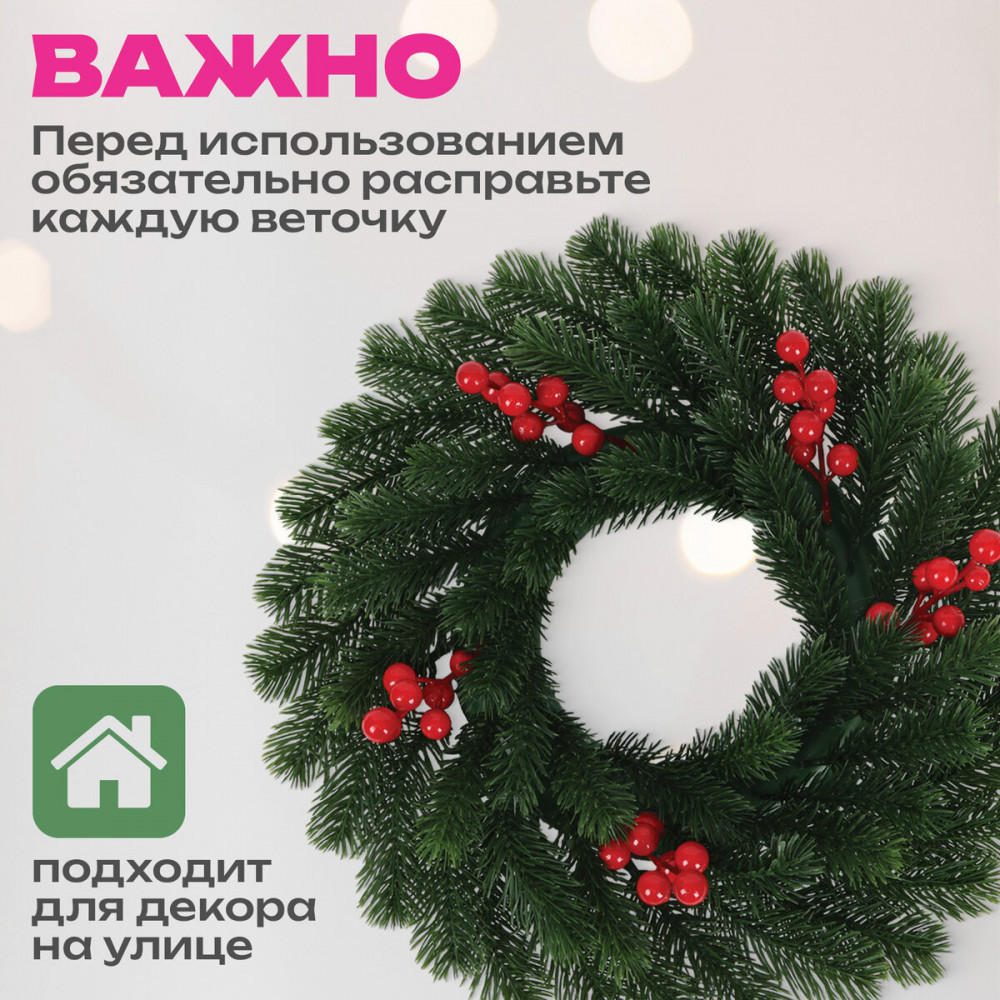 Материал — 100% литой ПЭТ. Цвет хвои — зелёный. Венок из литой ели украшен ветками красный ягодок. Венок выглядит, как натуральный, и создает особую праздничную атмосферу. На задней части основания венка расположено отверстие, за которое можно легко повесить венок на стену или дверь. Можно разместить не только на вертикальную, но и горизонтальную поверхность, сделав частью новогоднего украшения.