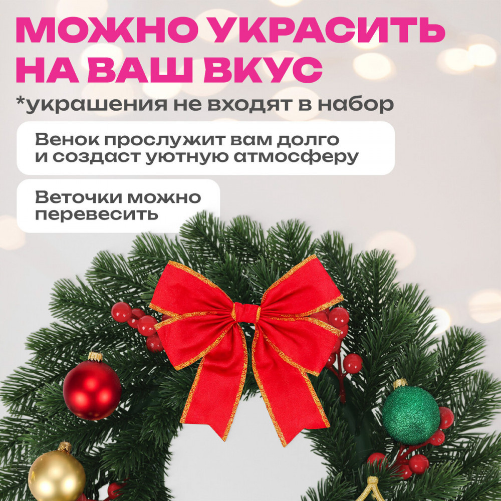 Венок новогодний станет прекрасным украшением для дома или офиса. Венок преобразит пространство и подарит ощущение праздника. Венок новогодний, диаметром 42 см представляет собой конструкцию из пластикового каркаса и закрепленных к нему ветвей.