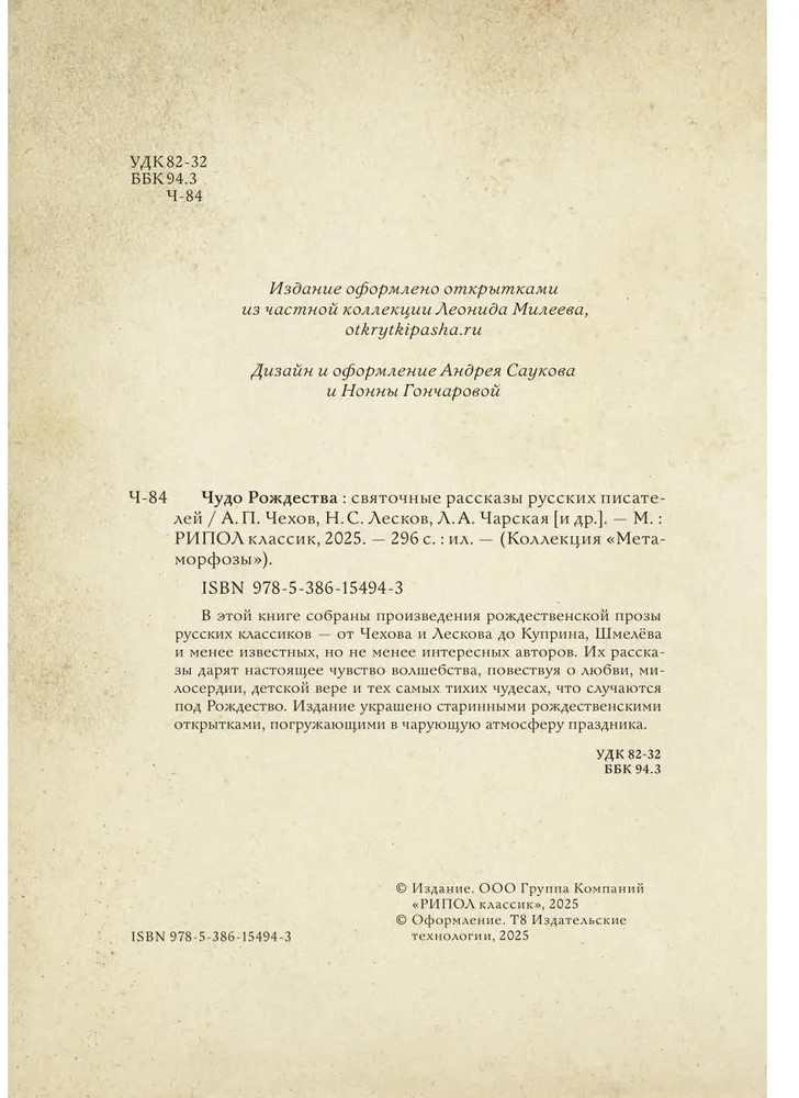 Серия: Коллекция «Метаморфозы» В этой книге собраны произведения рождественской прозы русских классиков — от Чехова и Лескова до Куприна, Шмелёва и менее известных, но не менее интересных авторов. Их рассказы дарят настоящее чувство волшебства, повествуя о любви, милосердии, детской вере и тех самых тихих чудесах, что случаются под Рождество. Издание украшено старинными рождественскими открытками, погружающими в чарующую атмосферу праздника. |