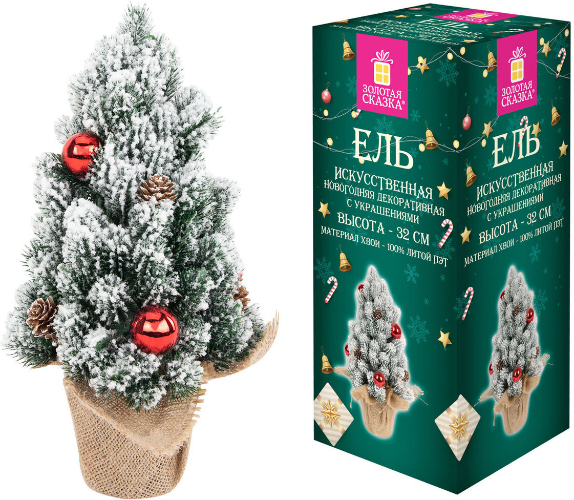 Золотая сказка Ель новогодняя искусственнаяновинка В данный момент этот товар отсутствует в продаже. Возможно, у нас найдется аналогичный или похожий товар здесь. Ель ЗОЛОТАЯ СКАЗКА станет прекрасным украшением для дома или офиса. Ель преобразит пространство и подарит ощущение праздника. Заснеженная ель высотой 32 см представляет собой конструкцию из пластикового каркаса и закрепленных к нему ветвей. Материал — 100% литой ПЭТ. Цвет хвои — зелёный. Иголки украшены искусственным белым снегом и декоративными сосновыми шишками размером 2 см и пластиковыми шарами красного цвета диаметром 2 см. Материал подставки — пластик, обёрнутый декоративной холщовой тканью. Высота ели — 32 см. Тип крепления ветвей к стволу — примотка. Такой тип крепления подразумевает, что ветви уже прикреплены к стволу и после покупки их необходимо самостоятельно расправить, чтобы ель приобрела нужную форму. |