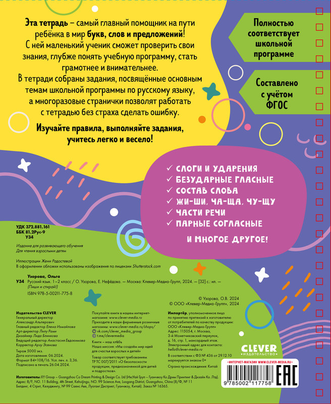 Серия: Пиши и стирай! Многоразовая тетрадь «Русский язык. 1-2 класс» — уникальный помощник для школьников младших классов. С помощью нее ребята смогут повторить основные темы программы начальной школы: слоги и ударения, безударные гласные, состав слова, правила написания слогов жи-ши, ча-ща, чу-щу, частей речи, парных согласных и многое другое. В комплекте есть маркер, след которого легко стирается, поэтому при необходимости ребята могут возвращаться к уже сделанным заданиям, повторять пройденным материал и, самое главное, не бояться совершить ошибку. |