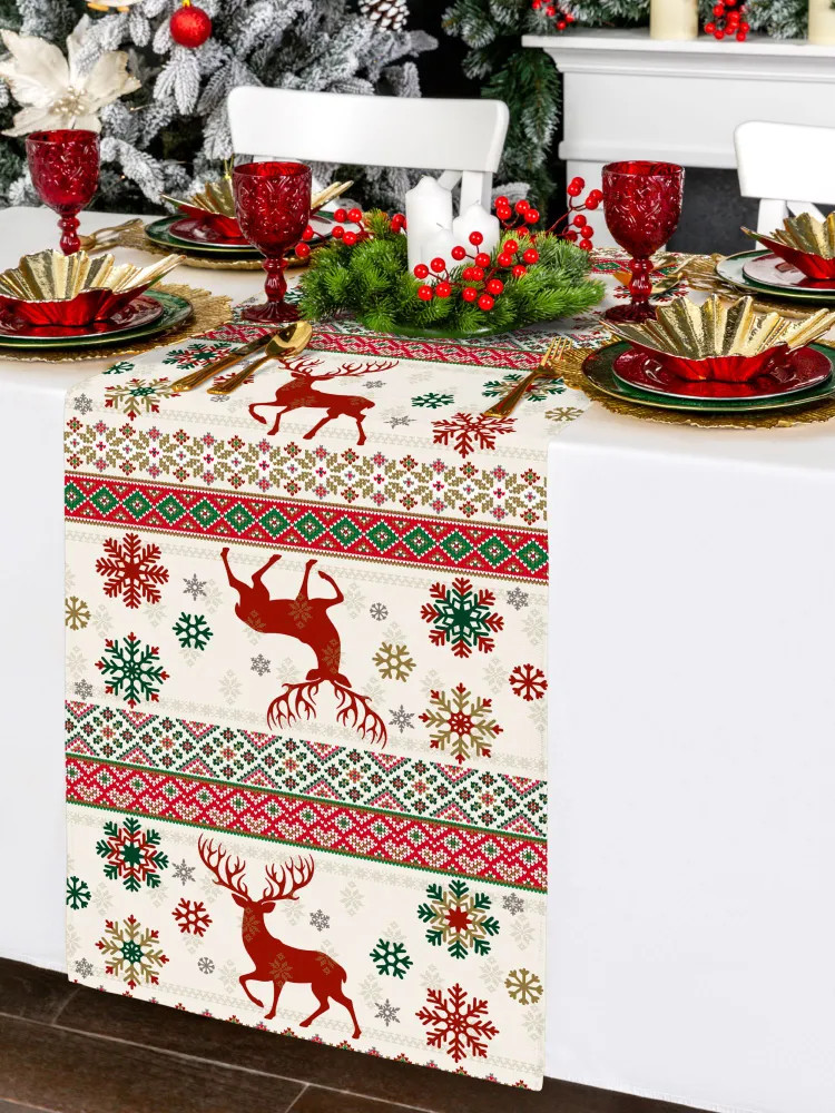 Новогодняя скатерть-дорожка из рогожки (100% хлопок) украсит собой праздничный стол, защитив его от царапин и других повреждений. Длинная прямоугольная скатерть — современный вариант сервировки рождественского стола. Скатерть из хлопчатобумажной, неприхотливой в уходе ткани сделает кухню по-настоящему стильной. Бежевая скатерть с зимним рисунком в скандинавском стиле — источник домашнего уюта. Разноцветные снежинки и красный олень на дорожке органично сочетаются с повторяющимися орнаментами.