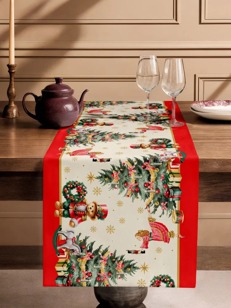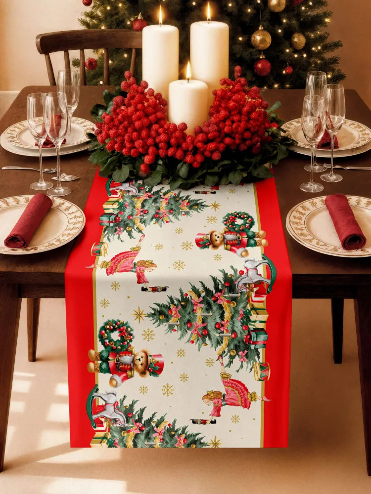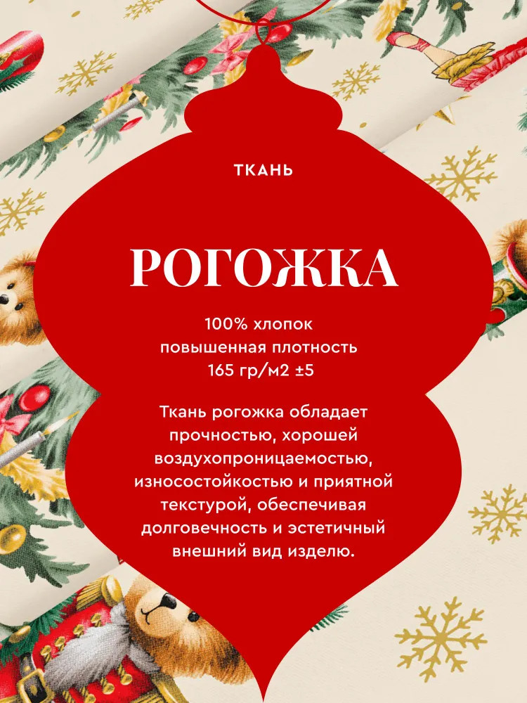 Стильная скатерть-дорожка — незаменимый предмет сервировки новогоднего стола! Плотная тканевая дорожка из рогожки отлично сохраняет форму за счет ровной обработки краев и качественной прострочки. Неприхотливая в уходе и устойчивая к выцветанию дорожка предотвратит появление царапин и пятен на кухонном столе. Прямоугольная дорожка создаст у вас в квартире уют. Красно-бежевая скатерть с рисунком новогодних елок и игрушек идеально дополнит интерьер кухни. Скатерть с детализированным принтом елочек, медвежат и подарков подарит вам улыбку на целый день и позволит погрузиться в детство.