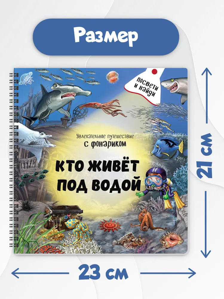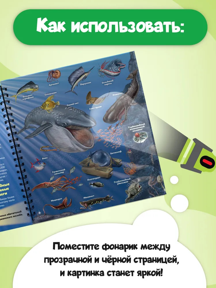 Необычная книга-энциклопедия. Состоит из цветных иллюстраций и пластиковых подложек, которые помогают ребенку осуществить увлекательное путешествие с помошью фонарика. Книга поможет найти и изучить кто живет под водой. Рекомендовано для детей с 3-х лет. |