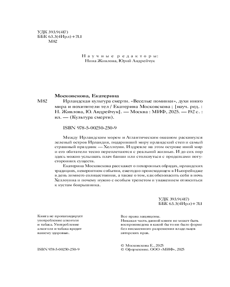 Серия: Культура смерти Книга филолога и профессионального гида Екатерины Московсковой расскажет о той мрачной стороне ирландской культуры, которую часто упускают из виду. Вы прочтете об астрономических обрядах в гробницах, гребнях банши и озорных бесенятах пука, узнаете, как ирландцы готовились к смерти и почему их поминки мало отличались от свадеб — а еще, быть может, поостережетесь отныне тревожить кусты боярышника... |