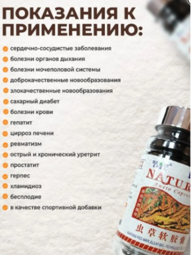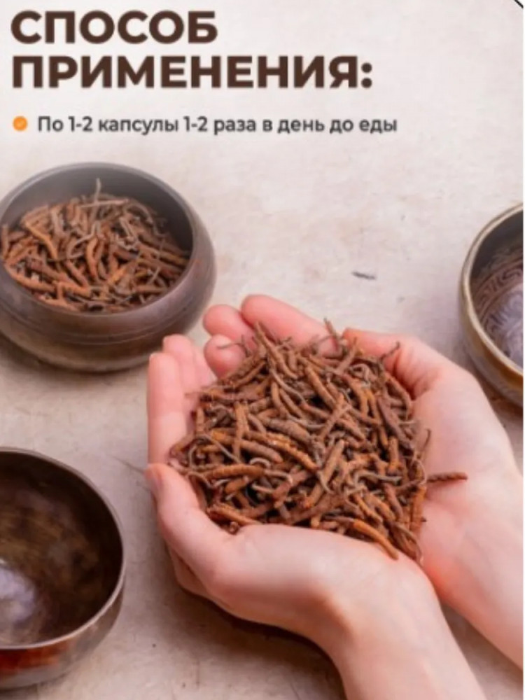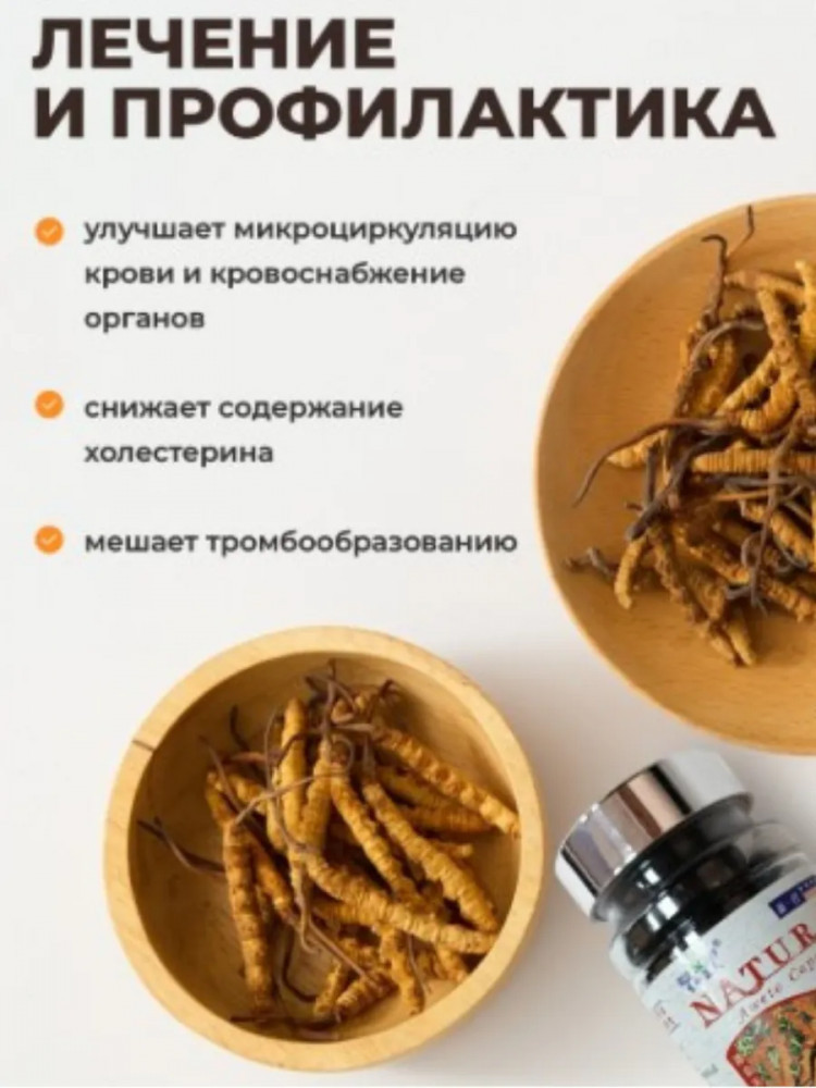 Кордицепс капсулы для укрепления иммунитета. Оно обладает противовирусными и бактериостатическими свойствами, способствует восстановлению организма и применяется в лечении и профилактике сердечно-сосудистых заболеваний, заболеваний печени, органов дыхания и мочеполовой системы. Кордицепс, являясь сильным природным энергетиком, также обладает противоопухолевыми и антиметастатическими свойствами. В настоящее время организму часто не хватает комплекса витаминов, таких как витамин D3, магний, омега-3, цинк, калий, биотин, железо, кальций D3 и др. В этом отношении природный гриб «Кордицепс» может быть полезным для укрепления иммунитета, борьбы с простудой, ОРВИ и противовирусных процессов. Он также способствует быстрой регенерации в послеоперационный период, замедляет процессы старения и поддерживает долгую молодость