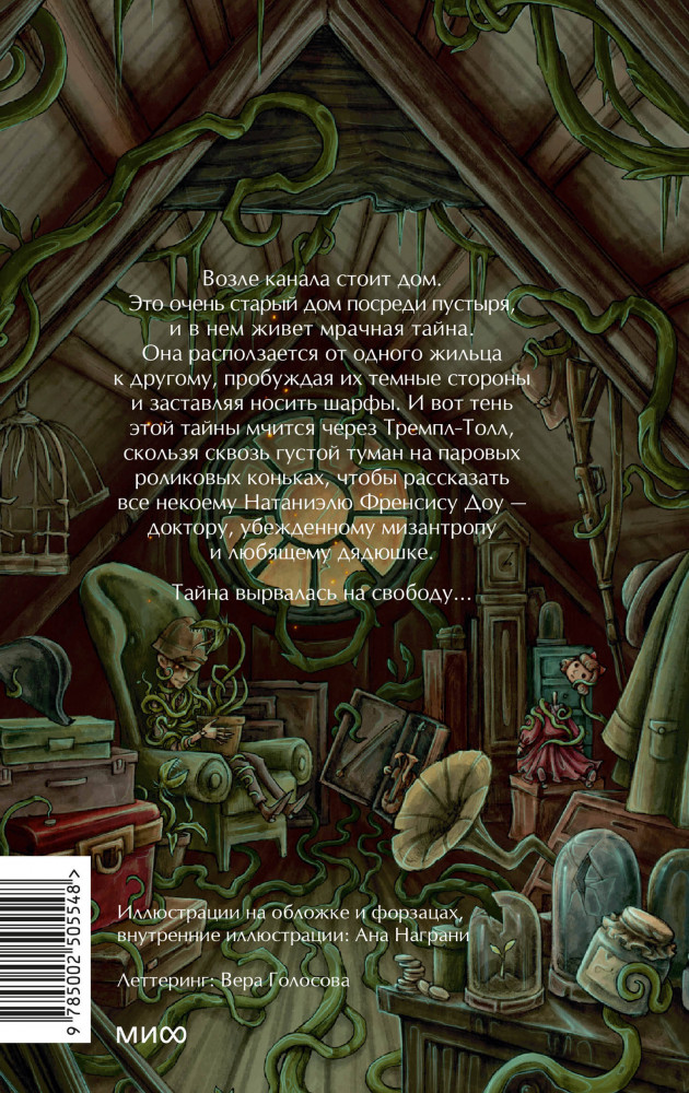 Серия: Таинственные истории из Габена Возле канала стоит дом. Это очень старый дом посреди пустыря, и в нем живет мрачная тайна. Она расползается от одного жильца к другому, пробуждая их темные стороны и заставляя их носить шарфы. Эту тайну пытались удержать внутри, но, как и любая зараза, она нашла путь наружу. И вот уже тень этой тайны мчится через Тремпл-Толл сквозь густой туман на паровых роликовых коньках. Мчится, чтобы рассказать всё некоему Натаниэлю Френсису Доу, доктору, убежденному мизантропу и любящему дядюшке. Тайна вырвалась на свободу... |