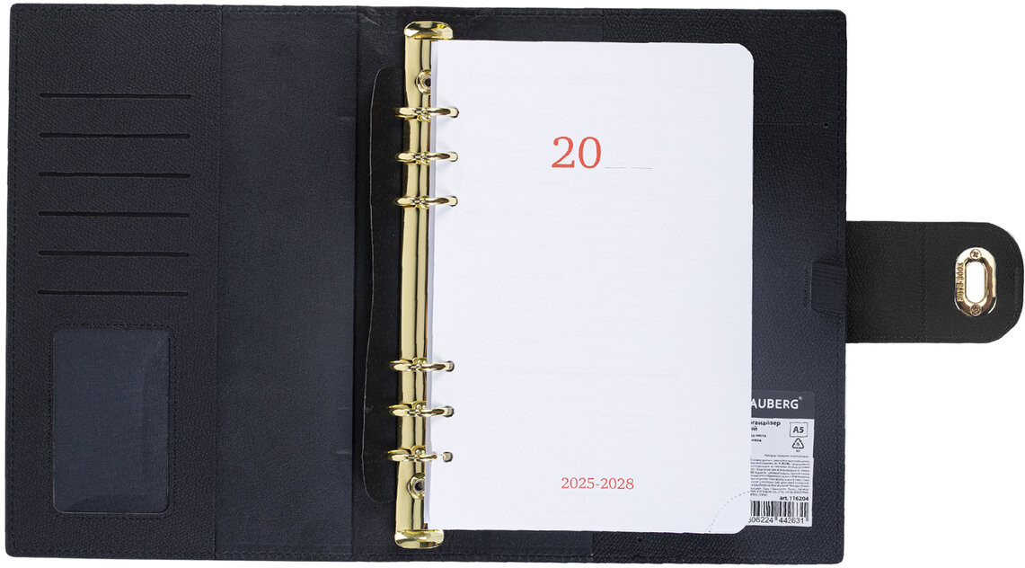 Недатированный ежедневник-органайзер Brauberg «Nova» выполнен в оригинальном стиле. Сочетает в себе удобство ежедневника и функциональность органайзера. Твердая обложка с кольцевым механизмом оснащена дополнительными карманами для хранения бумаг, карточек и мелочей. Съемный внутренний блок включает 160 листов белой бумаги плотностью 70 г/м2. Благодаря формату B5 (167×240мм) ежедневник удобно использовать как в офисе, так и на выездных деловых встречах. |