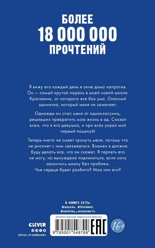 Каждый день в окне дома напротив Полина видит его — самого крутого парня в школе. Красавчика, от которого все без ума. Опасный и одинокий, он не удостаивал ее даже взглядом, но однажды спас от одноклассниц, решивших превратить жизнь девушки в кошмар. Сказал, что Полина его девушка и украл ее первый поцелуй при всех. Теперь никто не смеет обижать девушку, а сама она оказывается во власти человека, которого терпеть не может. Чье сердце будет разбито? Его или ее?