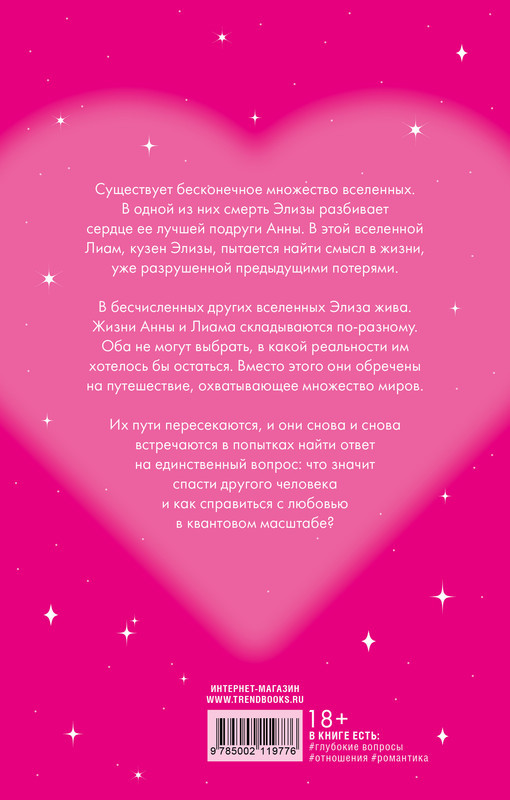 Серия: trendbooks Роман «Вселенная между нами» — завораживающая история любви в параллельных вселенных от популярной американской писательницы Шеннон Данлоп. В одной из Вселенных смерть Элизы меняет жизнь ее кузена Лиама и лучшей подруги Анны. В бесчисленных других вселенных Элиза жива, а жизни Анны и Лиама складываются по-разному. Оба не могут выбрать, в какой реальности им хотелось бы остаться. Вместо этого они обречены на путешествие, охватывающее множество миров. Их пути снова и снова пересекаются, они снова и снова встречаются, чтобы найти ответ на вопрос: как справиться с любовью в квантовом масштабе? |
