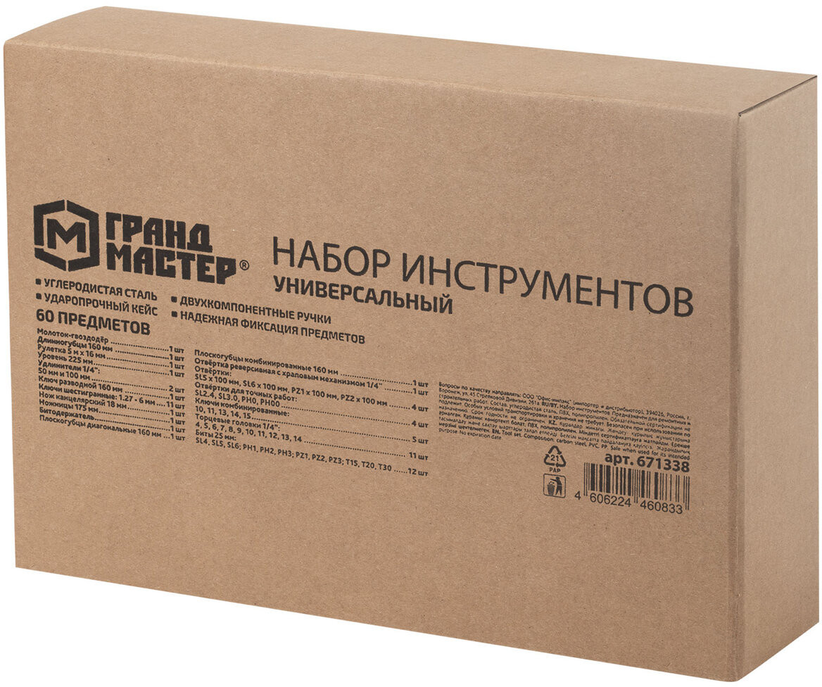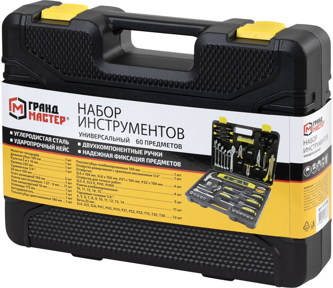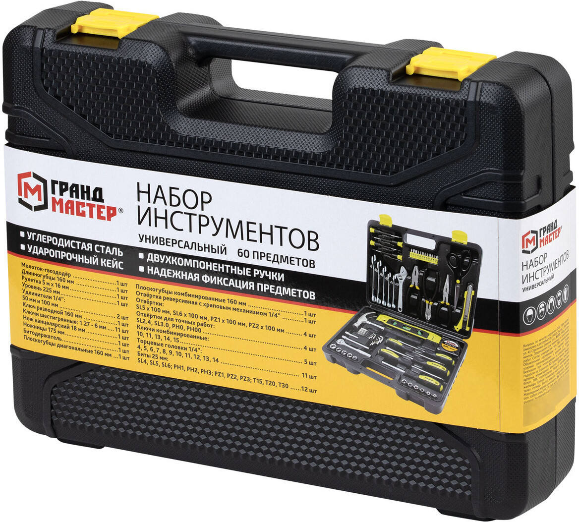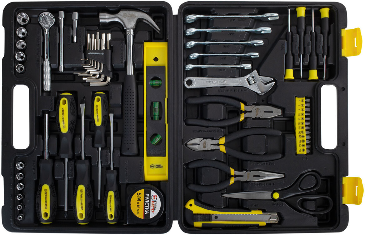 Универсальный набор инструментов Грандмастер станет незаменимым помощником как в быту, так и в профессиональной деятельности. Состав набора позволит выполнять задачи различной сложности – от мелкого ремонта до профессионального монтажа.