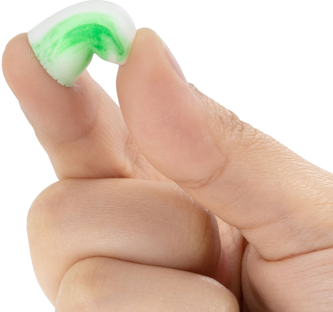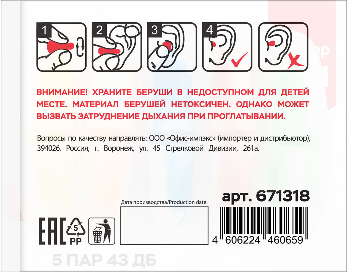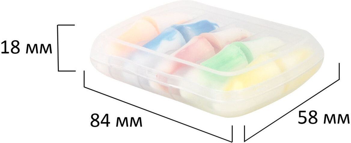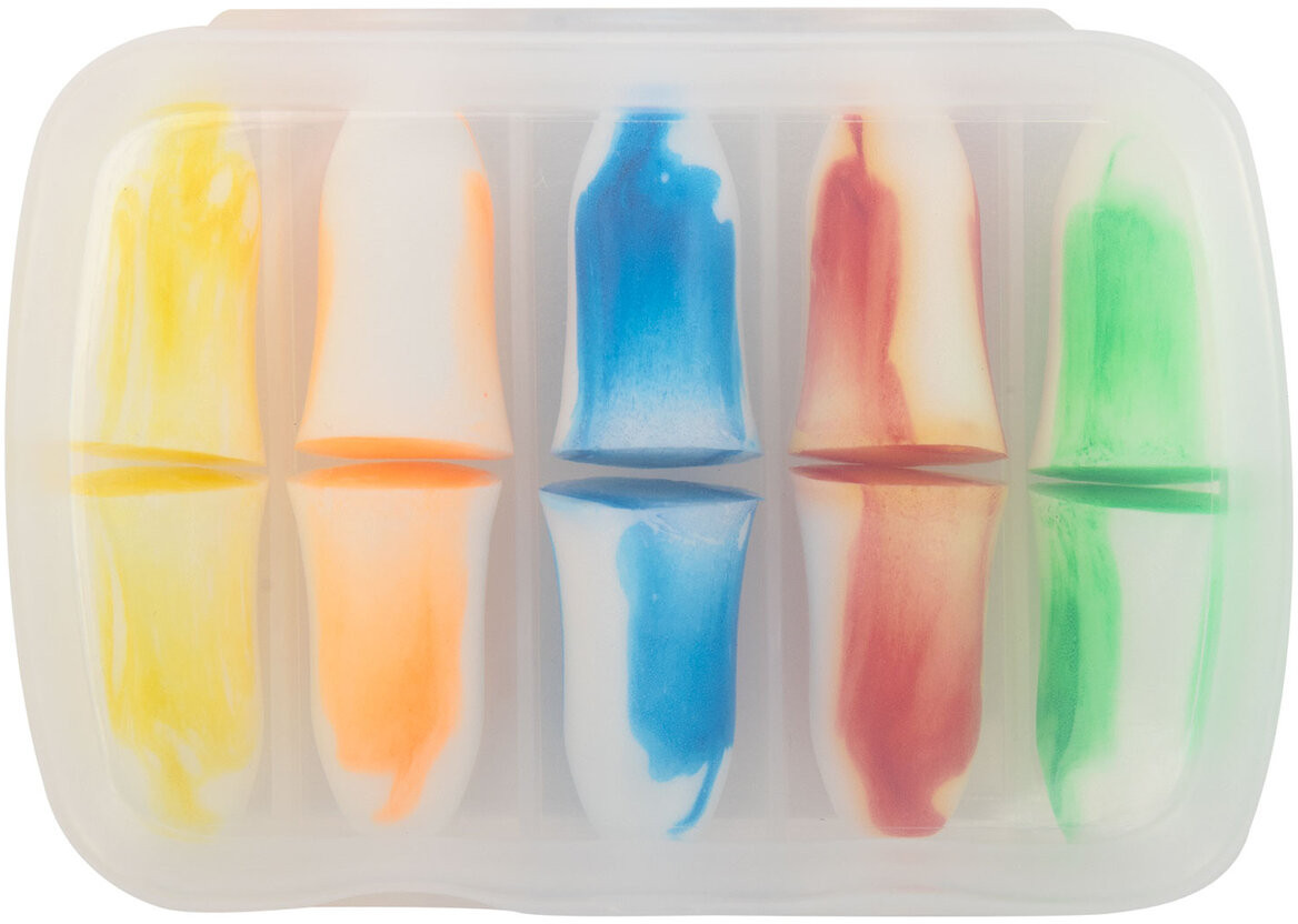 5 пар двухцветных вкладышей располагаются в пластиковом контейнере для удобства хранения и переноски. Диаметр берушей может меняться с 11 мм (в исходном состоянии) до 5 мм в сжатом (перед непосредственным применением). Акустическая эффективность — 43 дБ. Материал — вспененный полиуретан. Цвета в сочетании с белым: жёлтый, красный, синий, оранжевый, зелёный. Упакованы в индивидуальный пакет (5 пар в контейнере в пакете).