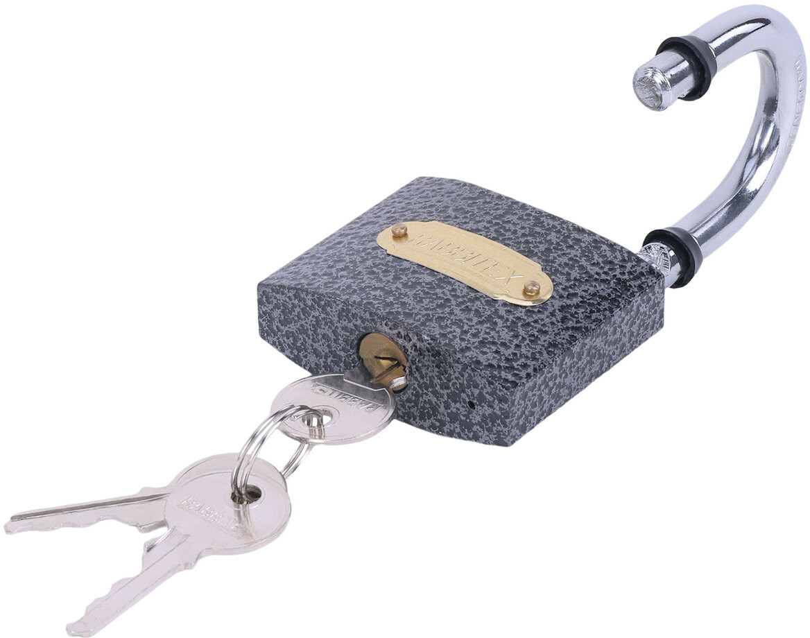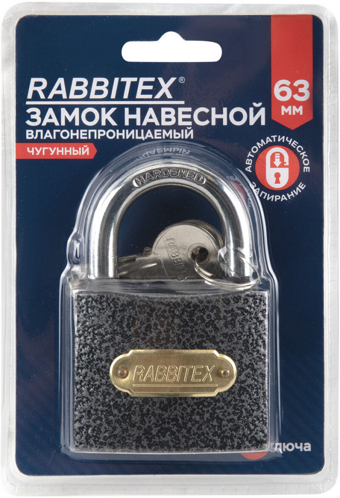 Замок навесной Rabbitex с цилиндровым механизмом секретности предназначен для запирания дверей, гаражных ворот, складов и других помещений. Достаточно прост по конструкции и надёжен в повседневной эксплуатации. Замок навесной имеет литой чугунный корпус и оснащен полукруглой дужкой из закаленной стали, что делает его прочным и увеличивает сопротивляемость к взлому. Тип механизма секретности — цилиндровый. Три английских ключа в комплекте. Замок запирается автоматически (без использования ключа) при нажатии на дужку сверху, что облегчает его эксплуатацию.