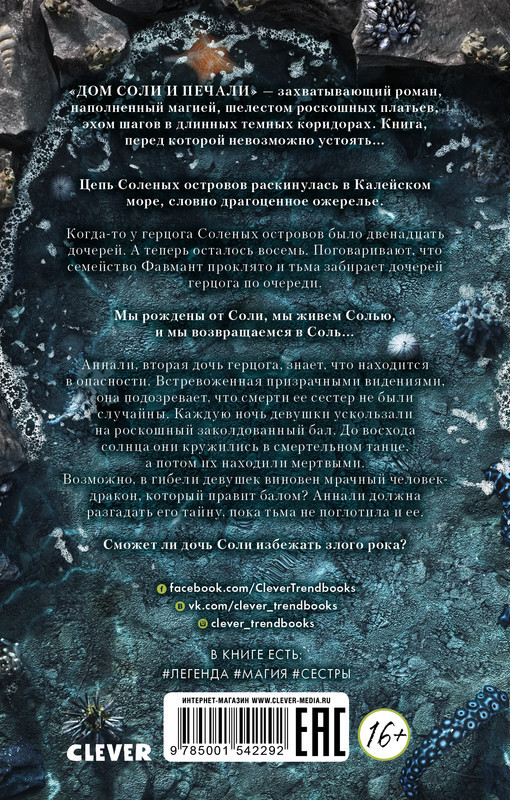 Роман, ставший хитом сразу после выхода. В морском царстве, в сказочном государстве прокляты двенадцать сестер... так начинается сюжет бестселлера Эрин Крейг. Цепь Соленых островов раскинулась в Калейском море, словно драгоценное ожерелье. Когда-то у герцога Соленых островов было двенадцать дочерей. А теперь осталось всего восемь. Поговаривают, что семейство Фавмант проклято, и тьма забирает дочерей герцога по очереди. Мы рождены от Соли, мы живем Солью и мы возвращаемся в Соль...