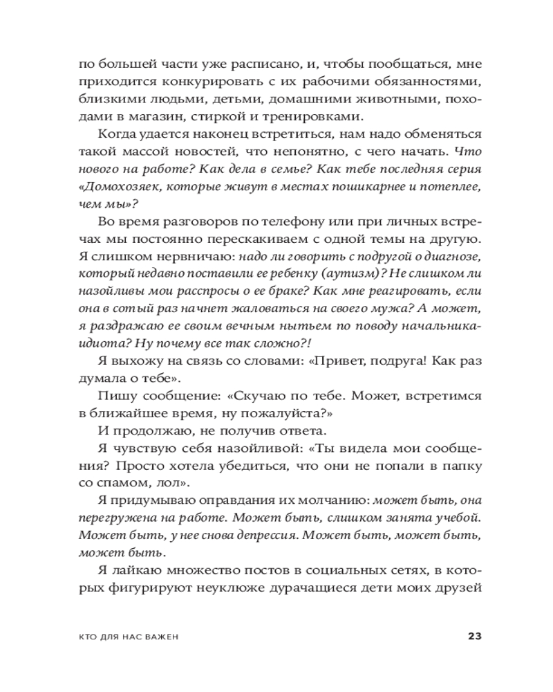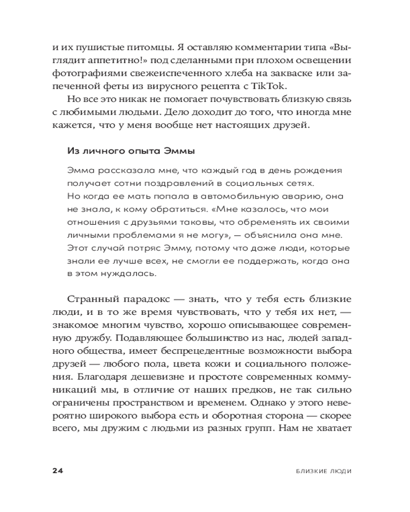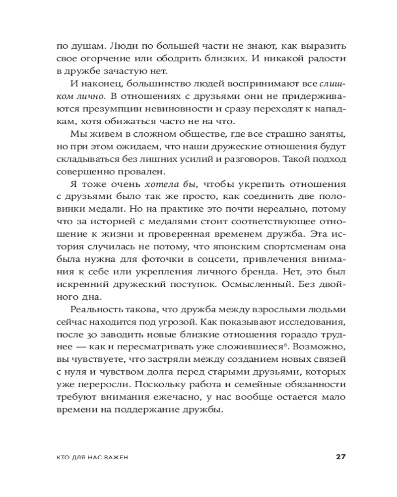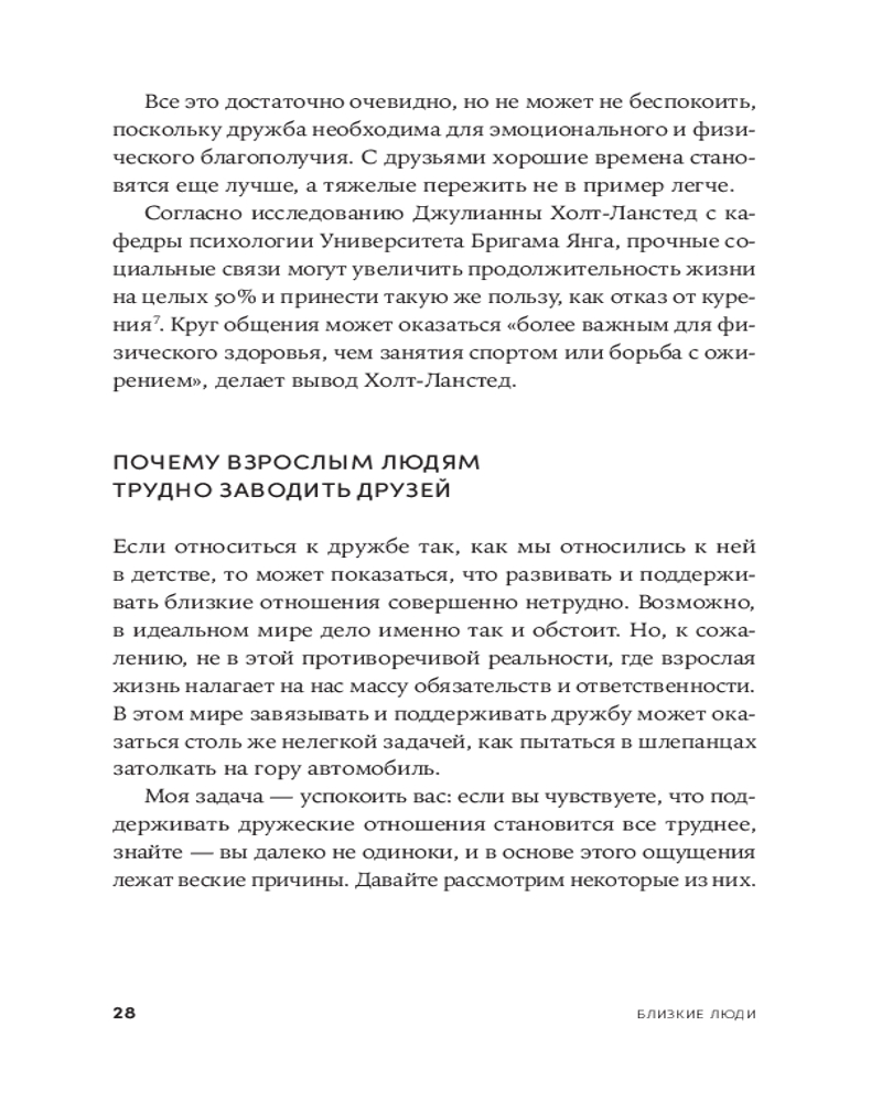 Идея дружбы во взрослом возрасте переживает кризис. Мы ожидаем, что близкие отношения сложатся сами собой, но статистика неумолима: после 25 лет социальный круг неизбежно сужается, каждые семь лет мы теряем половину знакомств, а более 300 млн человек вовсе не имеют ни одного друга. Современный образ жизни — постоянные переезды и смена работы, падающий уровень доверия и социальные сети, заменившие живое общение, — разрушает основы дружбы. |