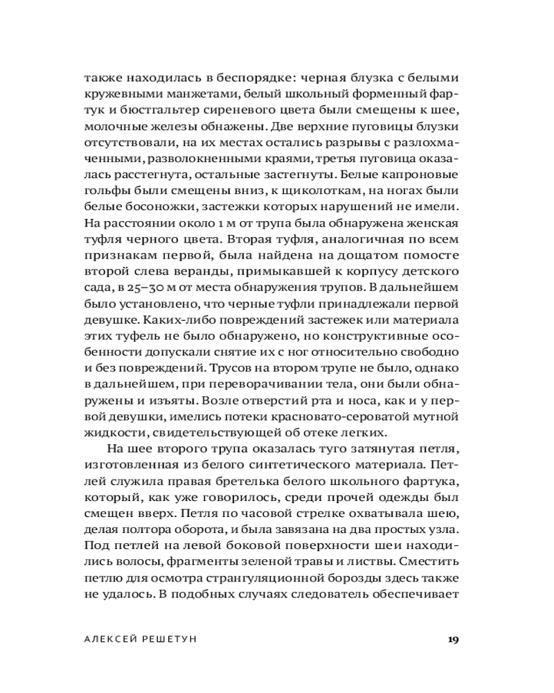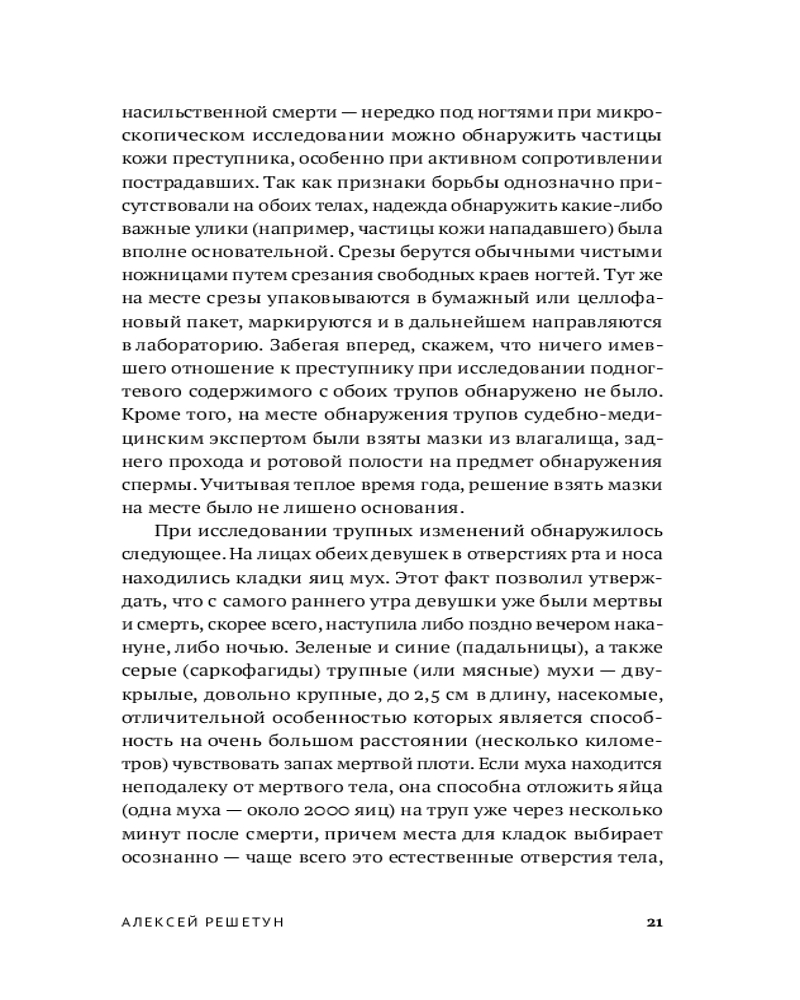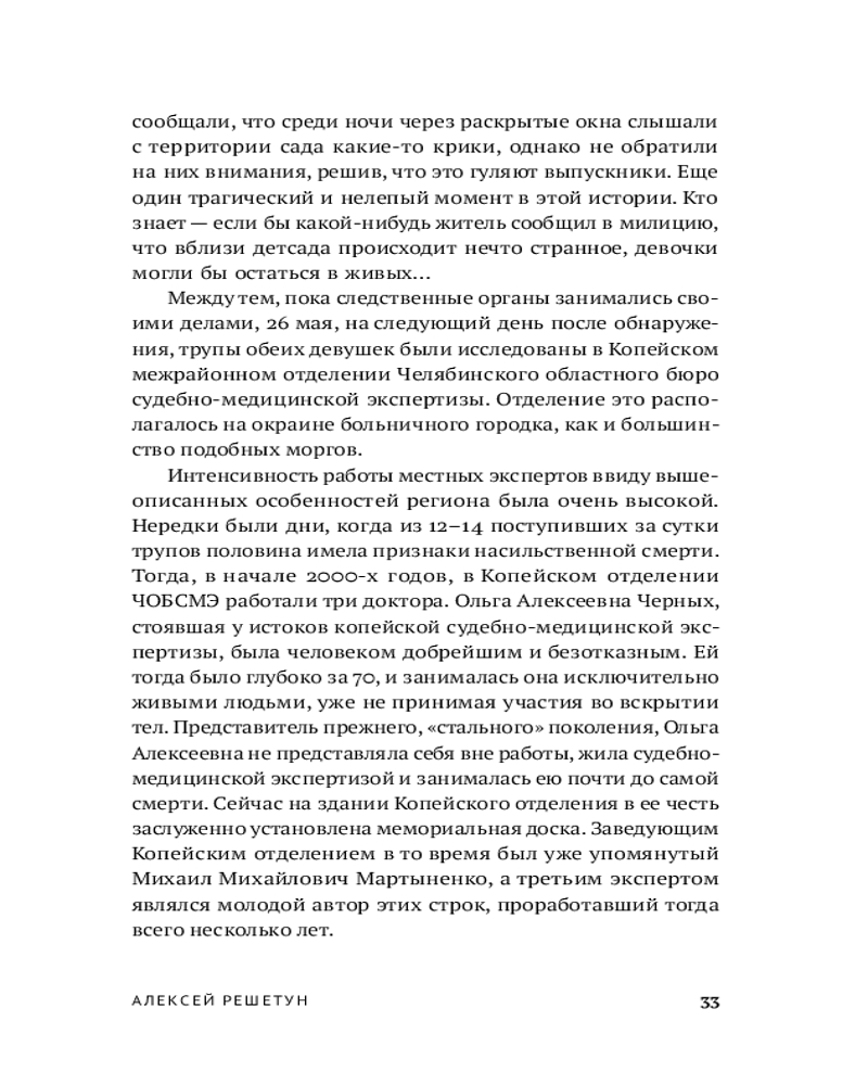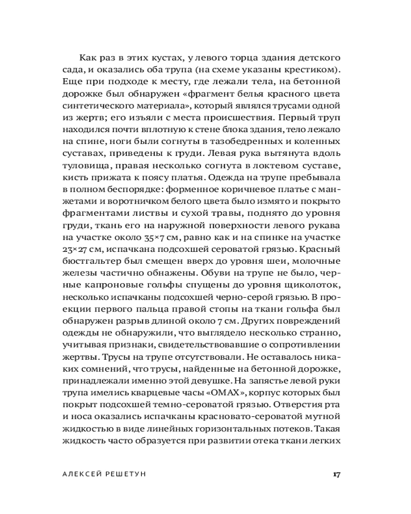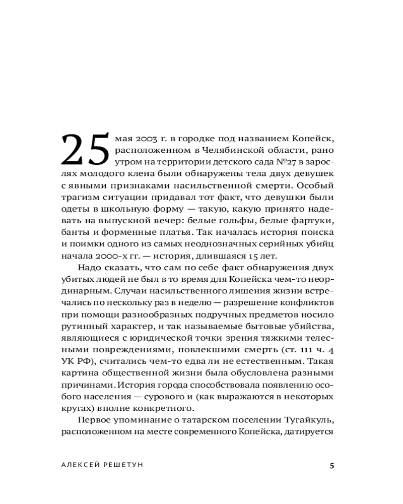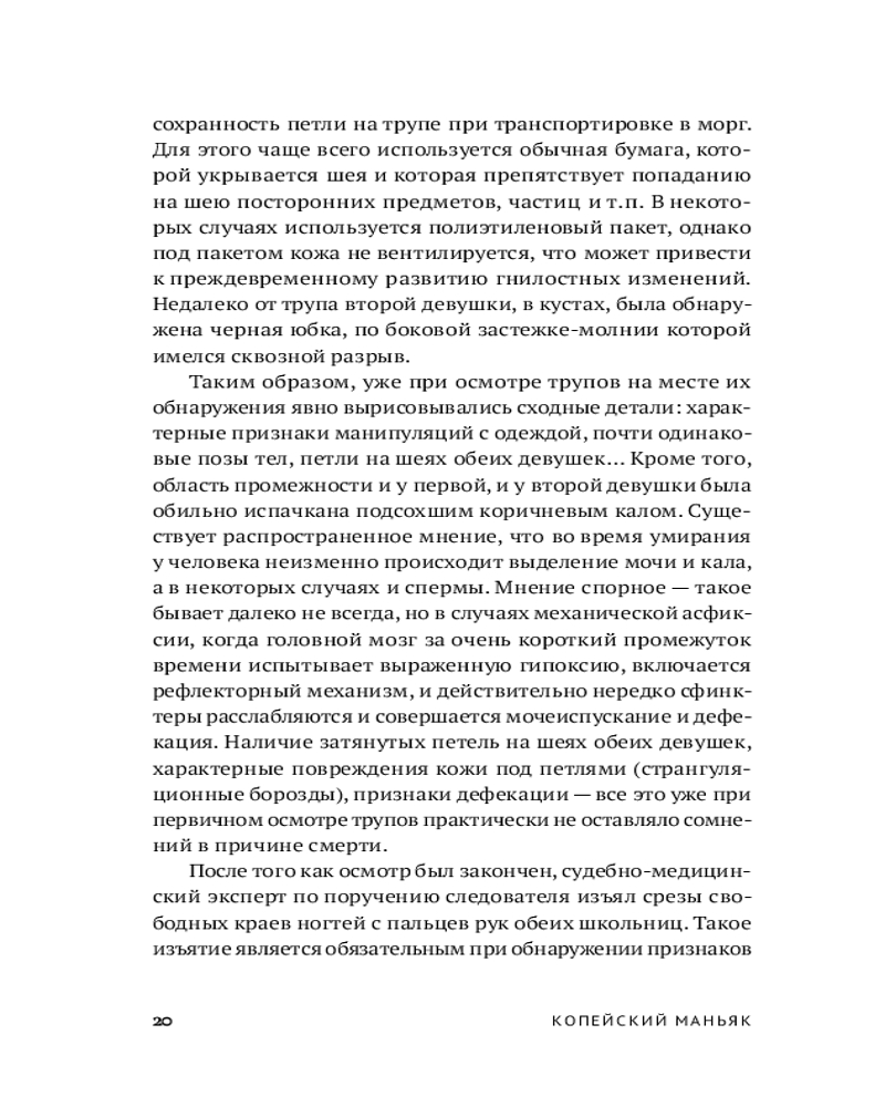 Судебно-медицинский эксперт и автор бестселлера «Вскрытие покажет» Алексей Решетун приглашает вас погрузиться в леденящую душу хронику одного из самых сложных расследований начала 2000‑х. 23 мая 2003 года в Копейске были обнаружены тела двух задушенных выпускниц в школьной форме — жестокое преступление, ставшее частью серии из шести убийств. Жертвами маньяка всегда оказывались женщины. Книга подробно описывает ход расследования и особенности работы следователей, медицинских экспертов и психиатров. |
