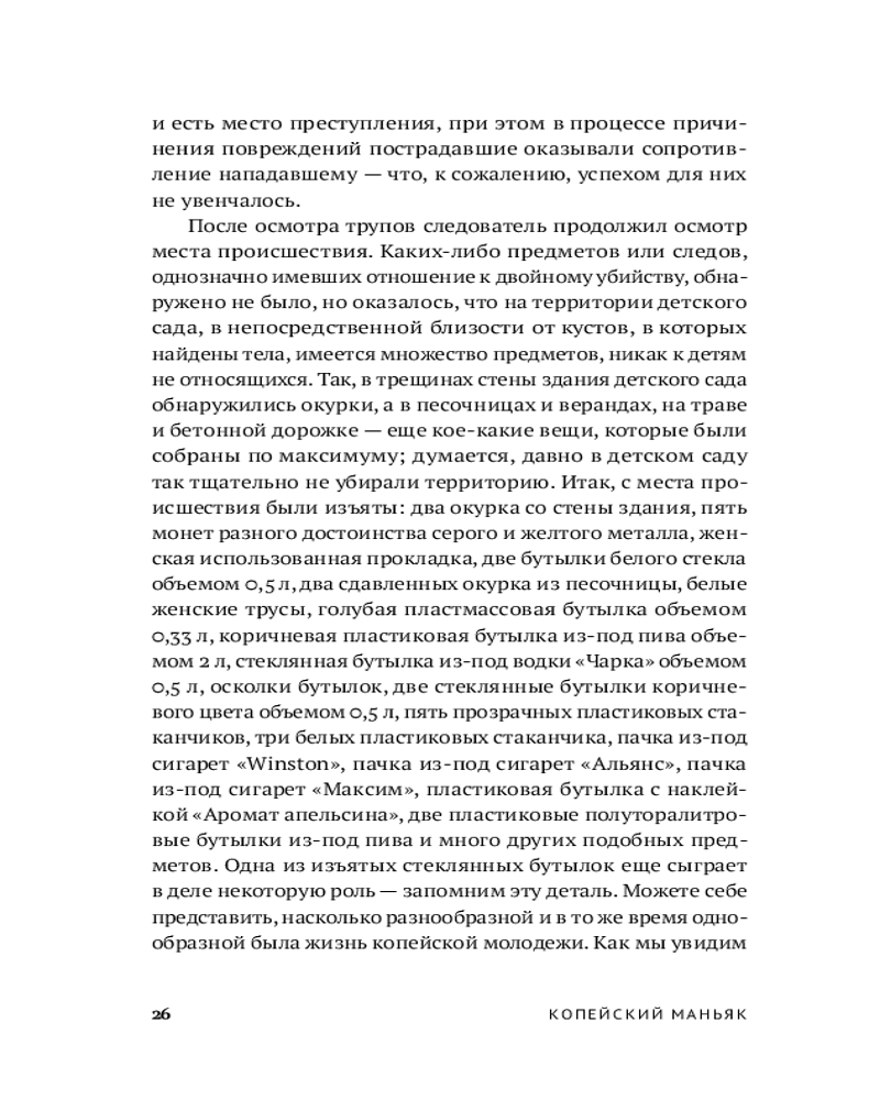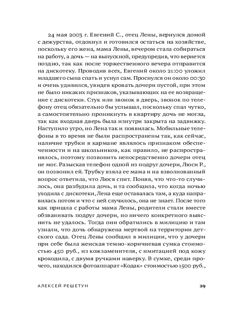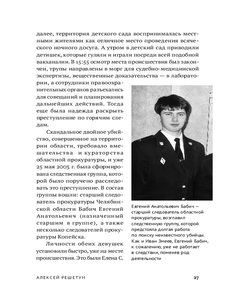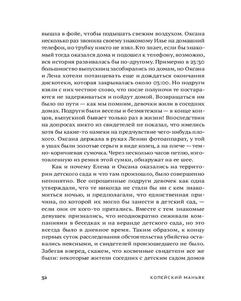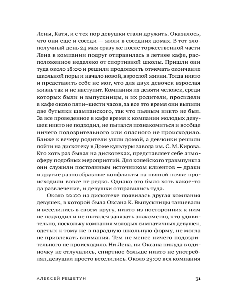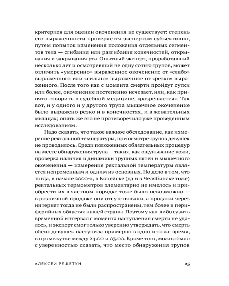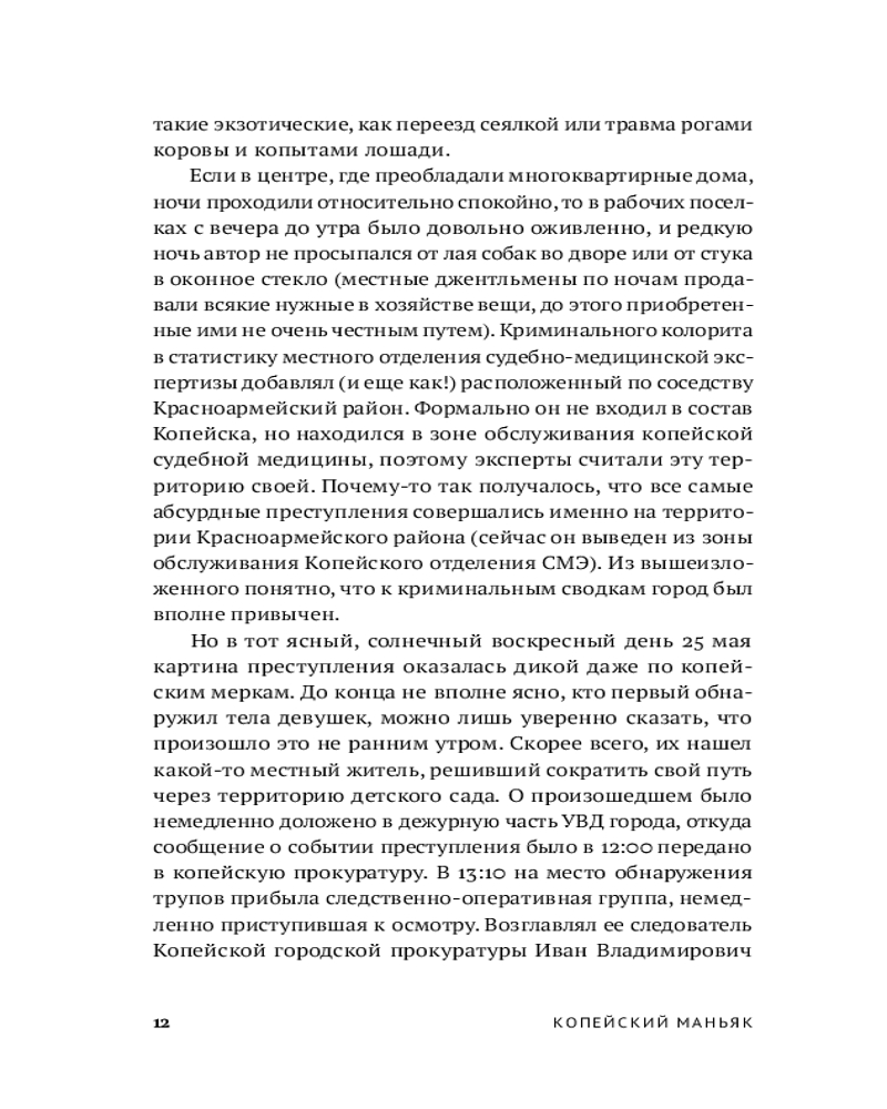 Судебно-медицинский эксперт и автор бестселлера «Вскрытие покажет» Алексей Решетун приглашает вас погрузиться в леденящую душу хронику одного из самых сложных расследований начала 2000‑х. 23 мая 2003 года в Копейске были обнаружены тела двух задушенных выпускниц в школьной форме — жестокое преступление, ставшее частью серии из шести убийств. Жертвами маньяка всегда оказывались женщины. Книга подробно описывает ход расследования и особенности работы следователей, медицинских экспертов и психиатров. |