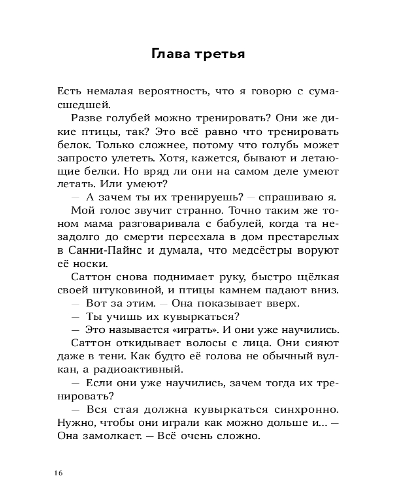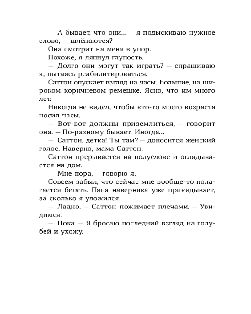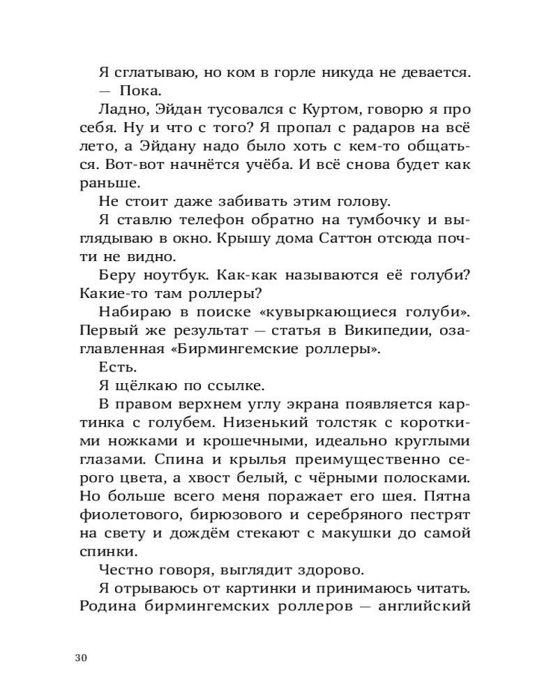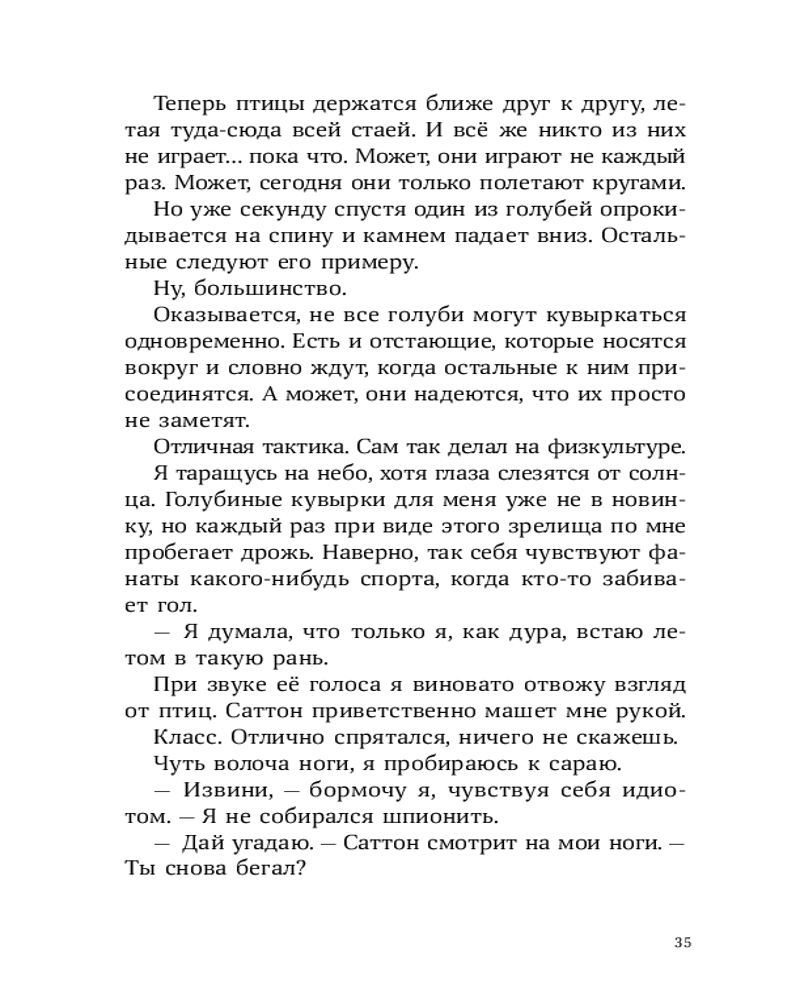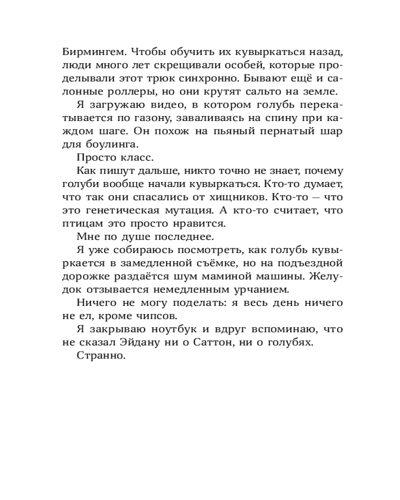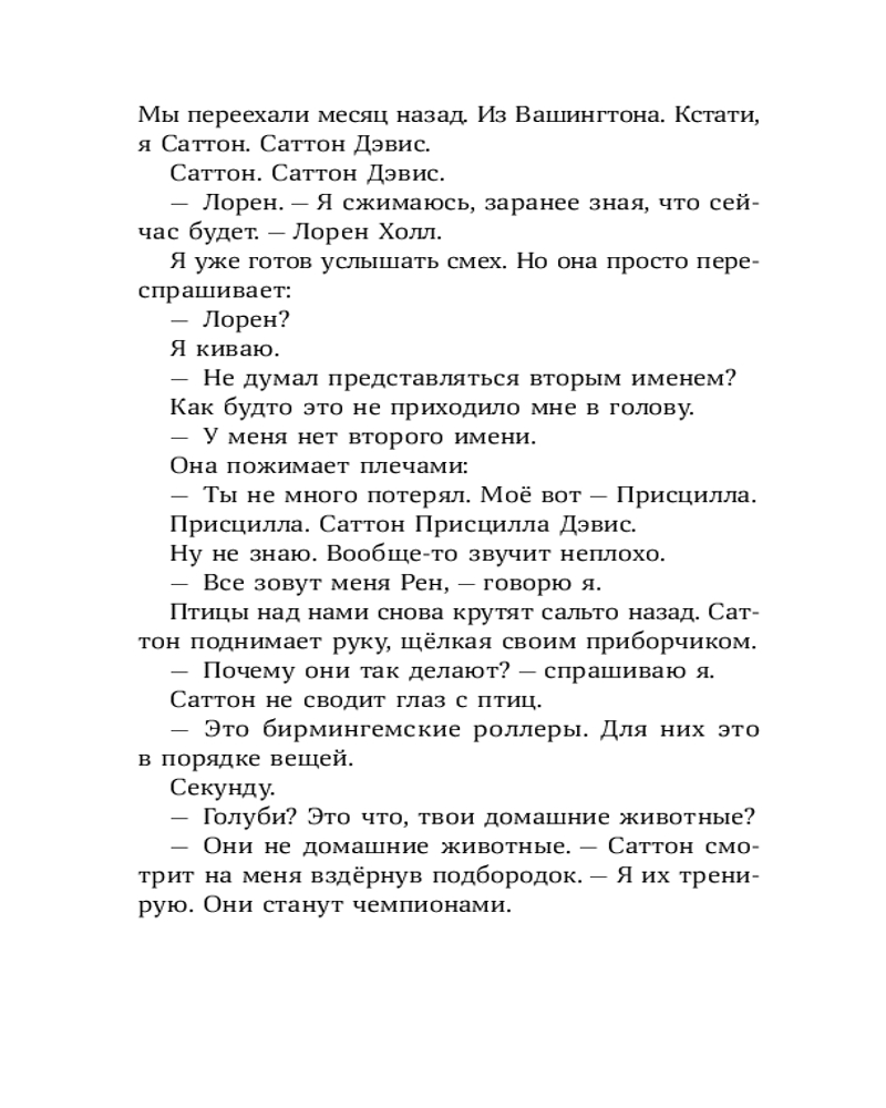 У Лорена Холла или просто Рена куча проблем: его семья переехала из города в старый бабушкин дом, лучший друг заводит крутую компанию, в которую Рен категорически не вписывается, а тренировки по бегу, которые так радуют отца Рена, бывшего тренера по кроссу, совсем не радуют самого мальчика. А тут еще и голуби над соседским домом странно себя ведут — взмывают вверх и камнем бросаются на землю, в последний момент делая кувырок. Оказывается, это не простые голуби, а бирмингемские роллеры. Новая соседка Рена, Саттон, тренирует их для соревнований. Из любопытства и ради возможности увильнуть от пробежек Рен все чаще навещает голубятню и постепенно открывает для себя новое захватывающее увлечение. Но как сказать папе, что предпочитаешь голубей марафону? И получится ли сохранить старую дружбу? |