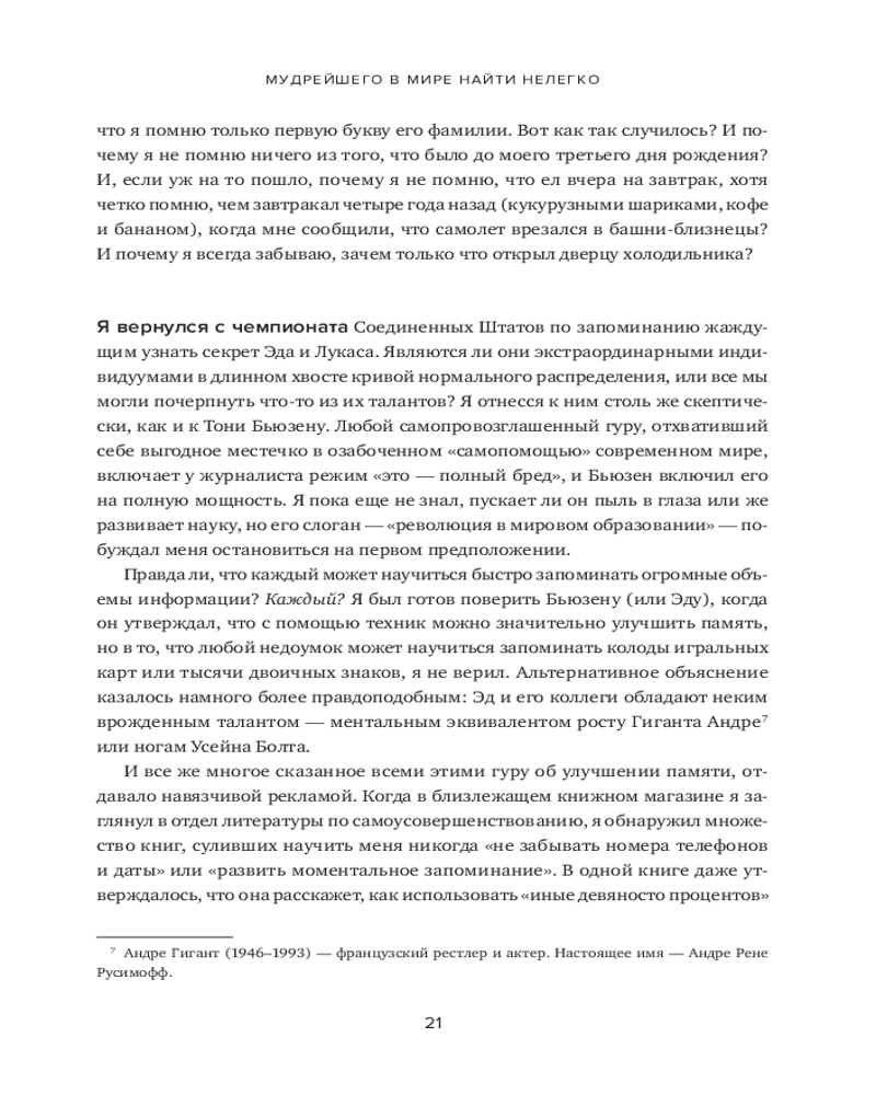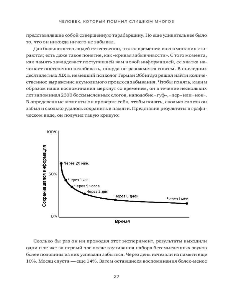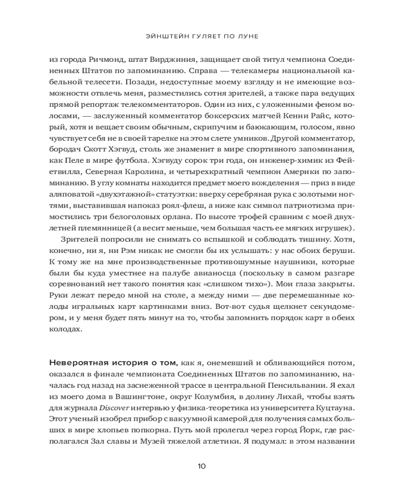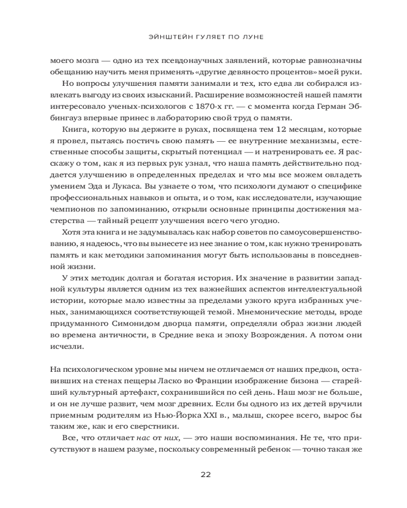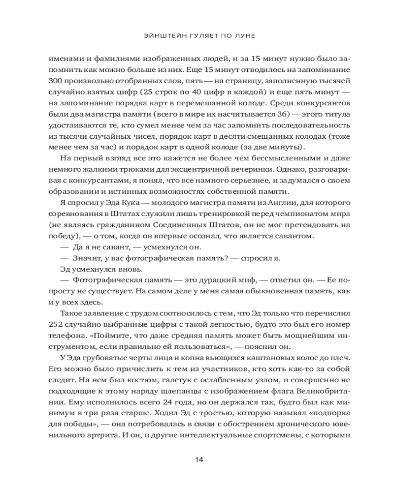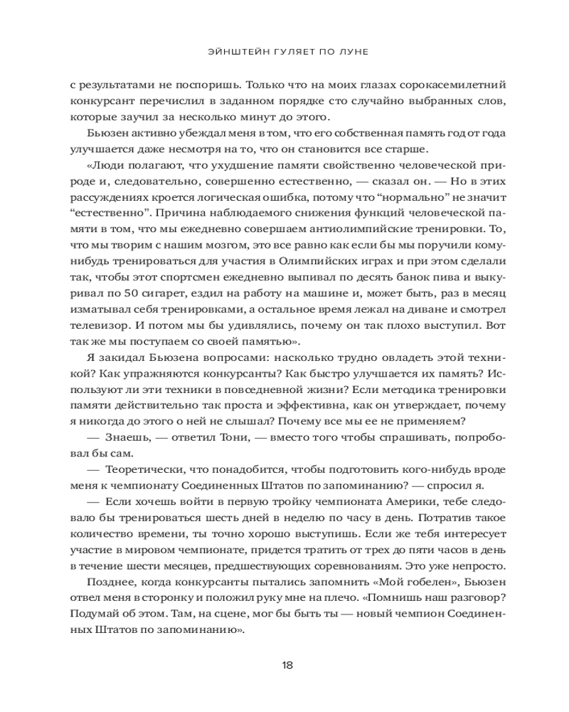 В книге рассказывается о 12 месяцах, которые автор провел, пытаясь постичь свою память — ее внутренние механизмы, естественные способы защиты, скрытый потенциал — и натренировать ее. Это, в сущности, рассказ о том, какое место память занимает в жизни всего человечества и каждого из нас. Как менялась функция памяти в течение тысячелетий? Какова роль техник запоминания в прошлом и настоящем? Может ли любой человек развить свою память до совершенства? И надо ли это? Вы узнаете, как нужно тренировать память и каким образом методики запоминания могут быть полезны в повседневной жизни. |