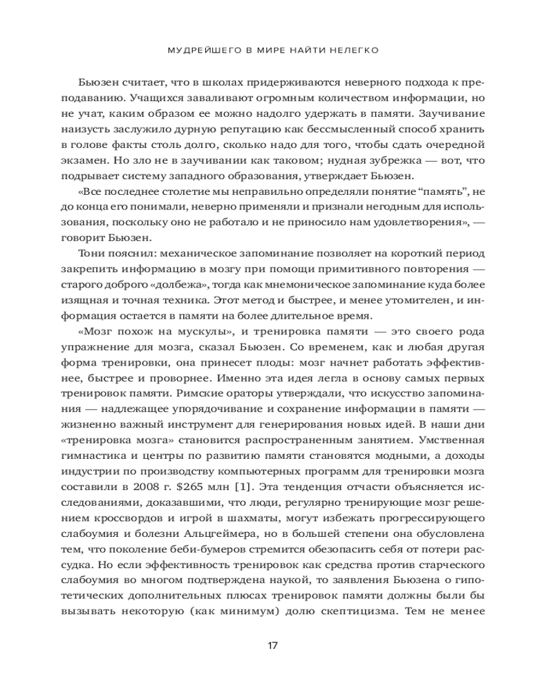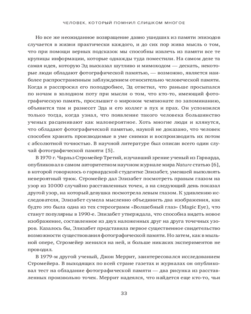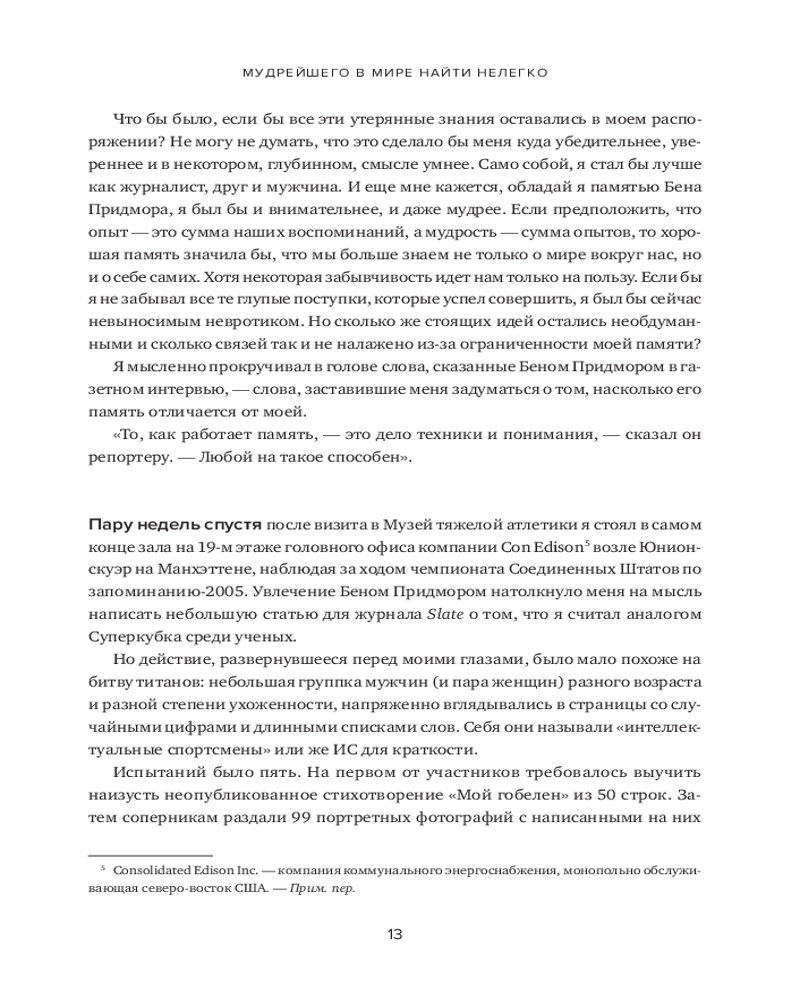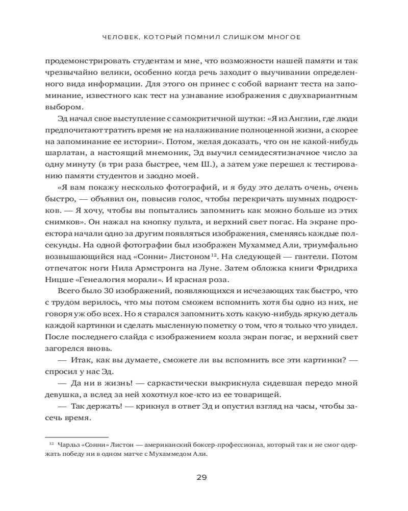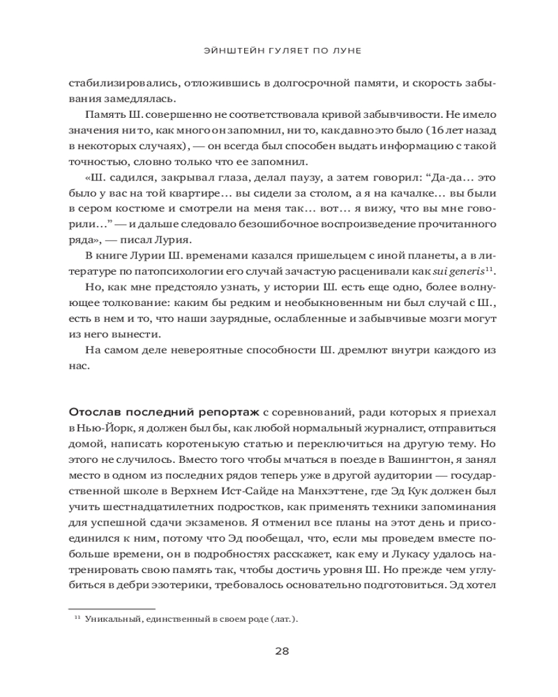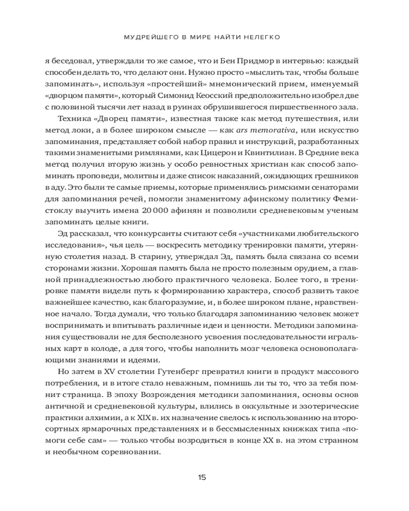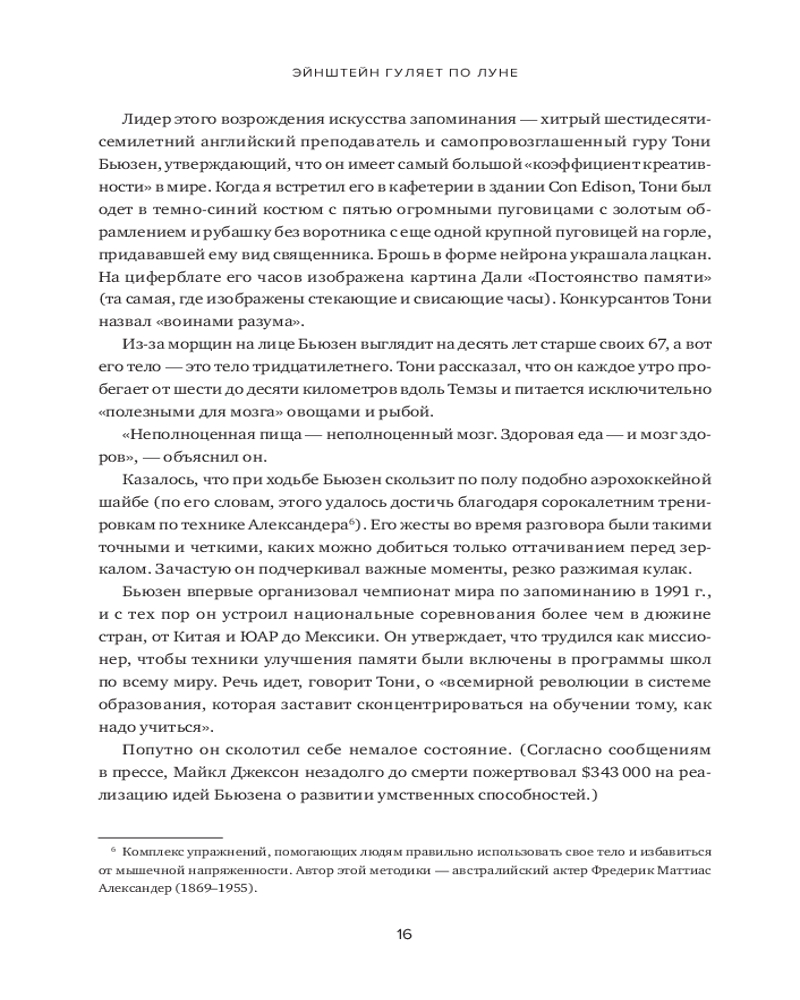 В книге рассказывается о 12 месяцах, которые автор провел, пытаясь постичь свою память — ее внутренние механизмы, естественные способы защиты, скрытый потенциал — и натренировать ее. Это, в сущности, рассказ о том, какое место память занимает в жизни всего человечества и каждого из нас. Как менялась функция памяти в течение тысячелетий? Какова роль техник запоминания в прошлом и настоящем? Может ли любой человек развить свою память до совершенства? И надо ли это? Вы узнаете, как нужно тренировать память и каким образом методики запоминания могут быть полезны в повседневной жизни. |