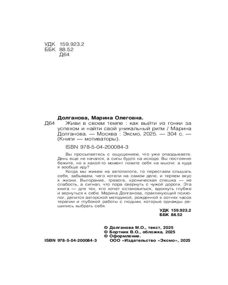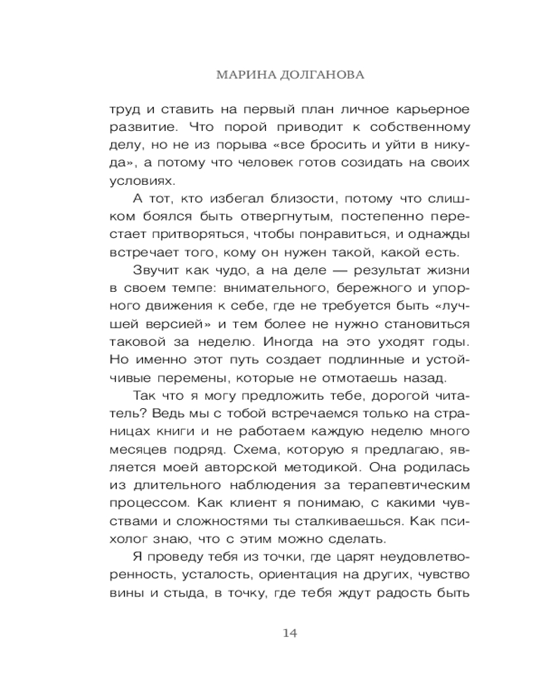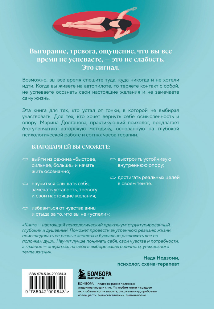 Серия: Книги-мотиваторы Выгорание, тревога, ощущение, что вы все время не успеваете — это не слабость. Это сигнал. Возможно, вы все время спешите туда, куда никогда и не хотели идти. Когда мы живем на автопилоте, то теряем контакт с собой, не успеваем осознать, чего действительно хотим, и не замечаем саму жизнь. Эта книга — для тех, кто устал от гонки, в которой не выбирал участвовать. Для тех, кто хочет вернуть себе осмысленность и опору. Марина Долганова, практикующий психолог, предлагает 6-ступенчатную авторскую методику, основанную на глубокой психологической работе и сотнях часов терапии. |