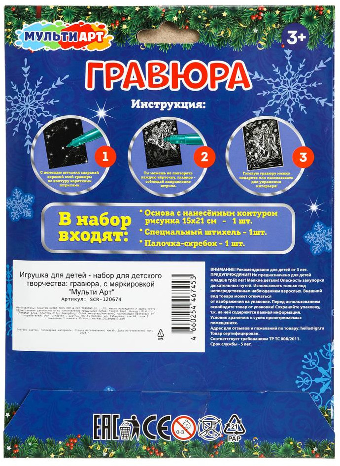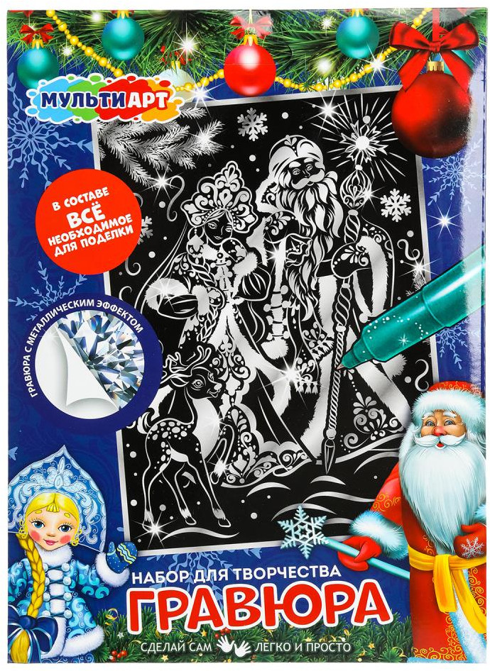 Набор для творчества — гравюра «Новый год» ТМ «Мульти Арт» — отличный подарок для ребёнка, который будет способствовать развитию его творческих способностей. С помощью данного набора юный художник сможет создать эффектную серебристую картину на чёрном фоне. Контур рисунка уже нанесён на основу, остаётся только процарапать изображение специальным штихелем. Можно не повторять каждую черточку, главное — соблюдать направление штриха! Готовая поделка станет отличным вариантом для подарка близким или для украшения интерьера комнаты. Занятия с наборами для творчества ТМ «Мульти Арт» развивают: внимание, усидчивость, творческое мышление, моторику рук и воображение. |