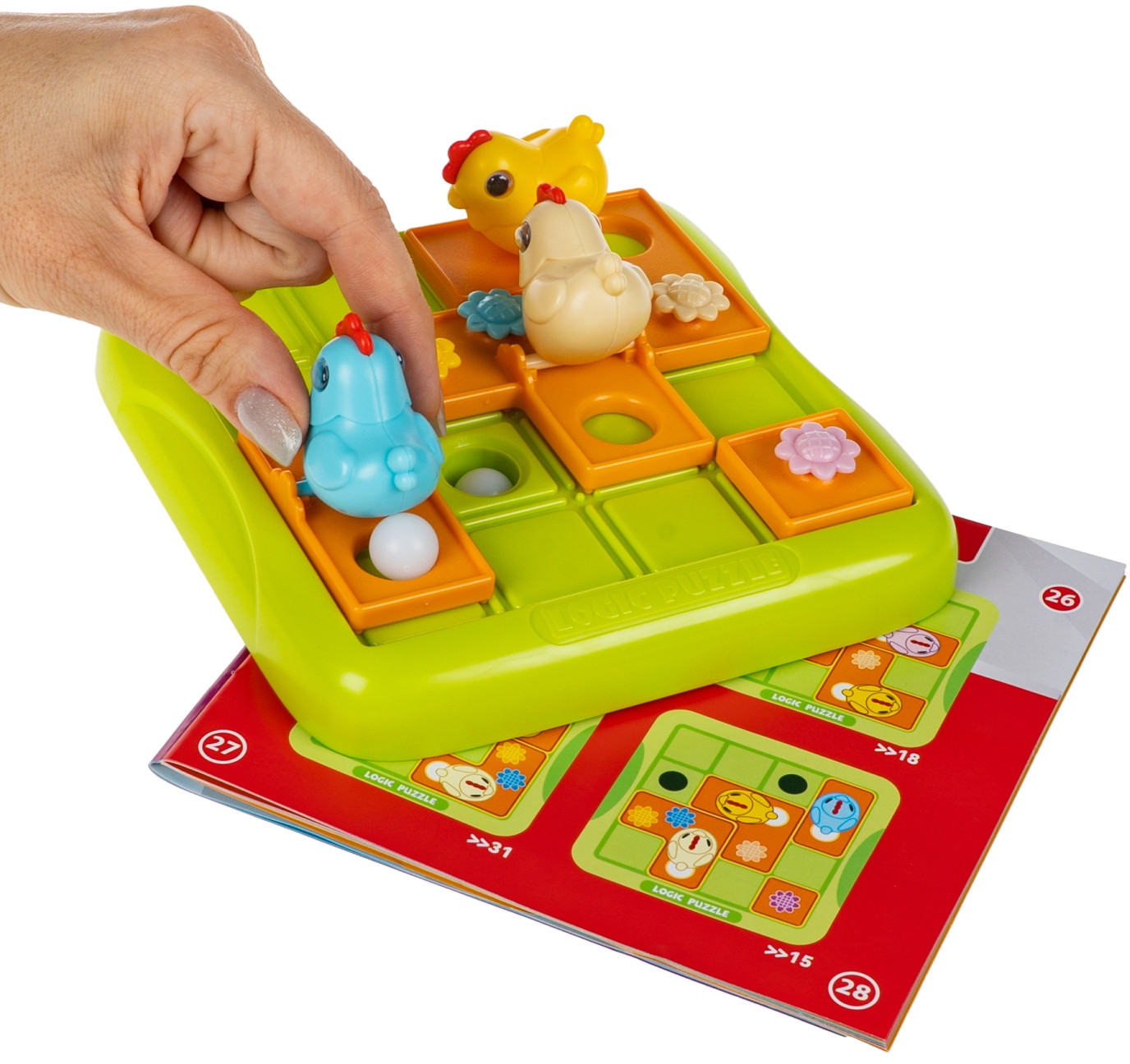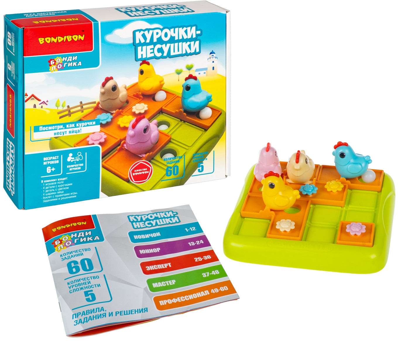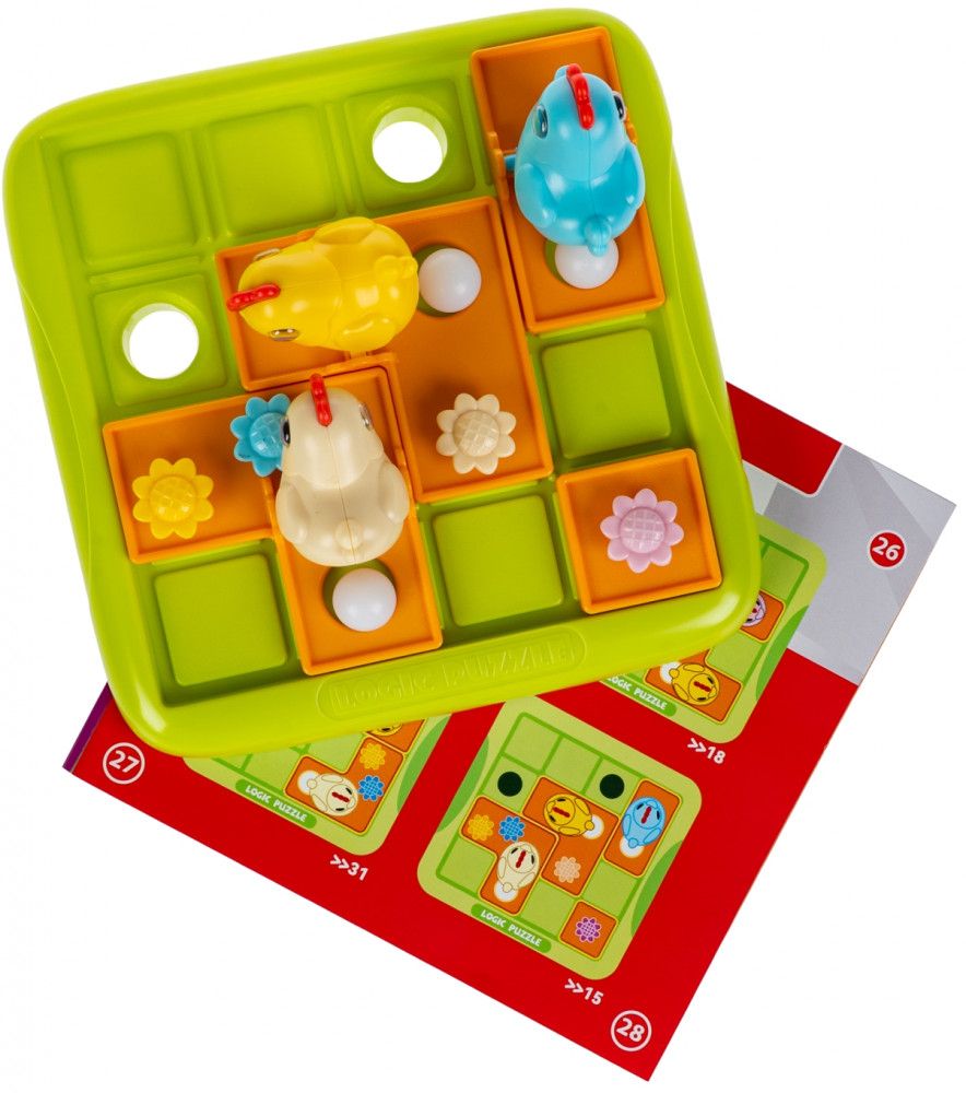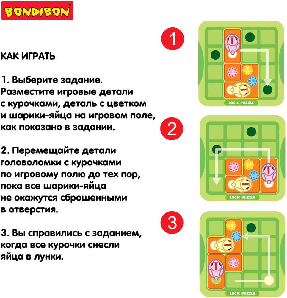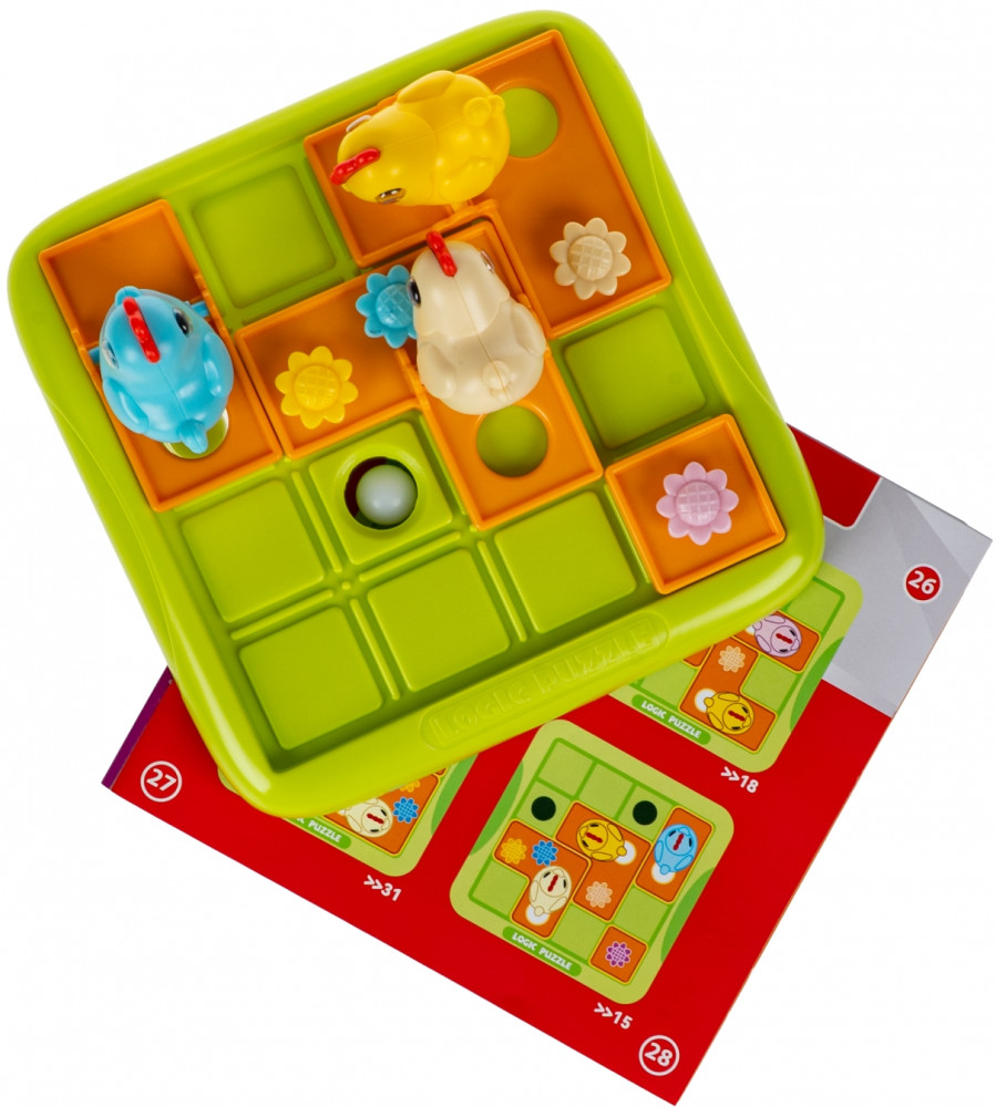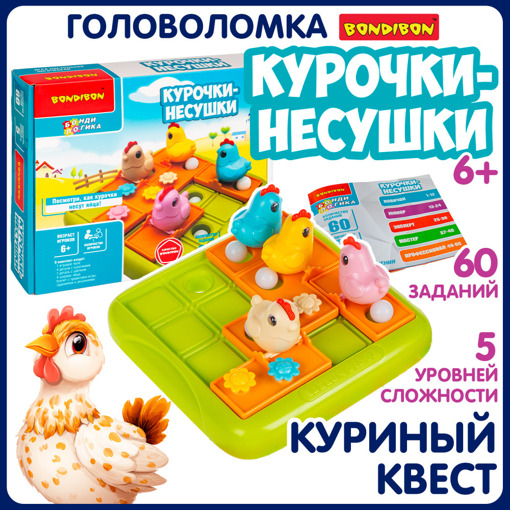 Посмотри, как ловко курочки раскладывают яйца по гнездам! Настольная логическая игра Курочки-несушки от Bondibon превращает обычную задачу в весёлую головоломку. Игроку предстоит управлять курицами и каждую из них довести до лунки, чтобы отложить яйцо! Выберите задание и разместите элементы на игровом поле. Передвигайте плитки с курочками, пока все яйца-шарики не скатятся в отверстия. Это логическая игра с механикой скользящих пазлов, которая требует продуманных пошаговых действий и терпения. Всего в игре 60 заданий с нарастающей сложностью. Головоломка Курочки-несушки тренирует навыки планирования, логику, внимание, моторику, пространственное мышление и зрительно-моторную координацию ребёнка.