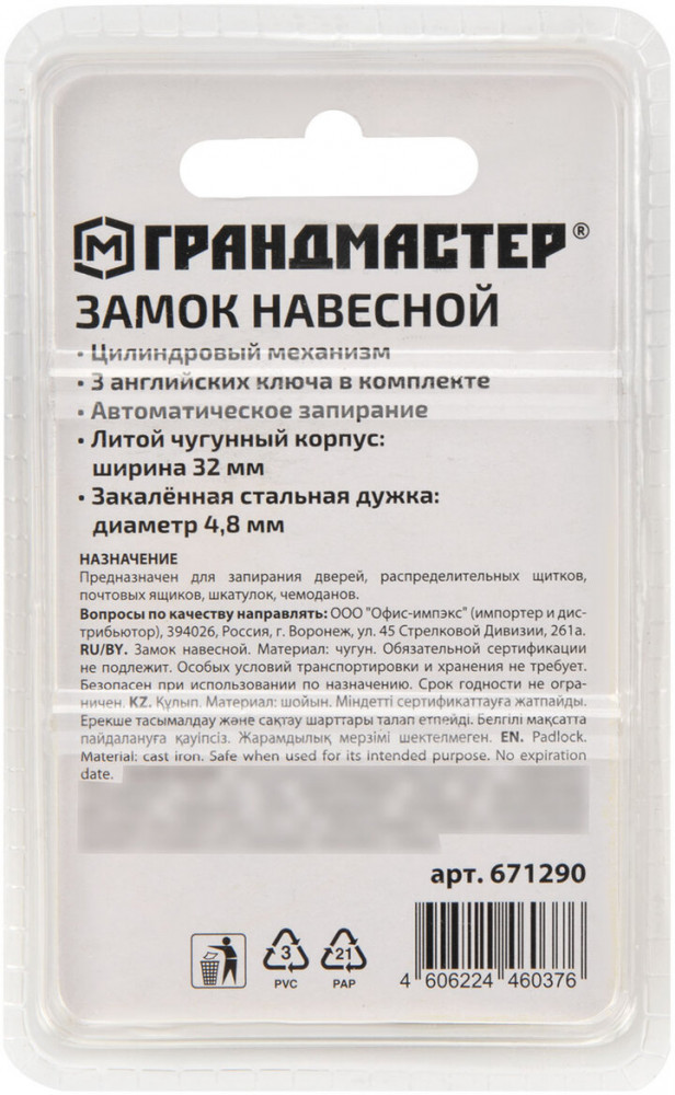 Замок навесной Грандмастер с цилиндровым механизмом секретности предназначен для запирания дверей, распределительных щитков, почтовых ящиков, шкатулок, чемоданов. Достаточно прост по конструкции и надёжен в повседневной эксплуатации. Замок навесной имеет литой чугунный корпус и оснащен полукруглой дужкой из закаленной стали, что делает его прочным и увеличивает сопротивляемость к взлому. Тип механизма секретности – цилиндровый. Три английских ключа в комплекте. Замок запирается автоматически (без использования ключа) при нажатии на дужку сверху, что облегчает его эксплуатацию. Небольшие размеры замка и толщина дужки позволяют использовать его в качестве замка для чемоданов, дорожных сумок, ящиков, шкафов, почтовых ящиков и распределительных щитков. |